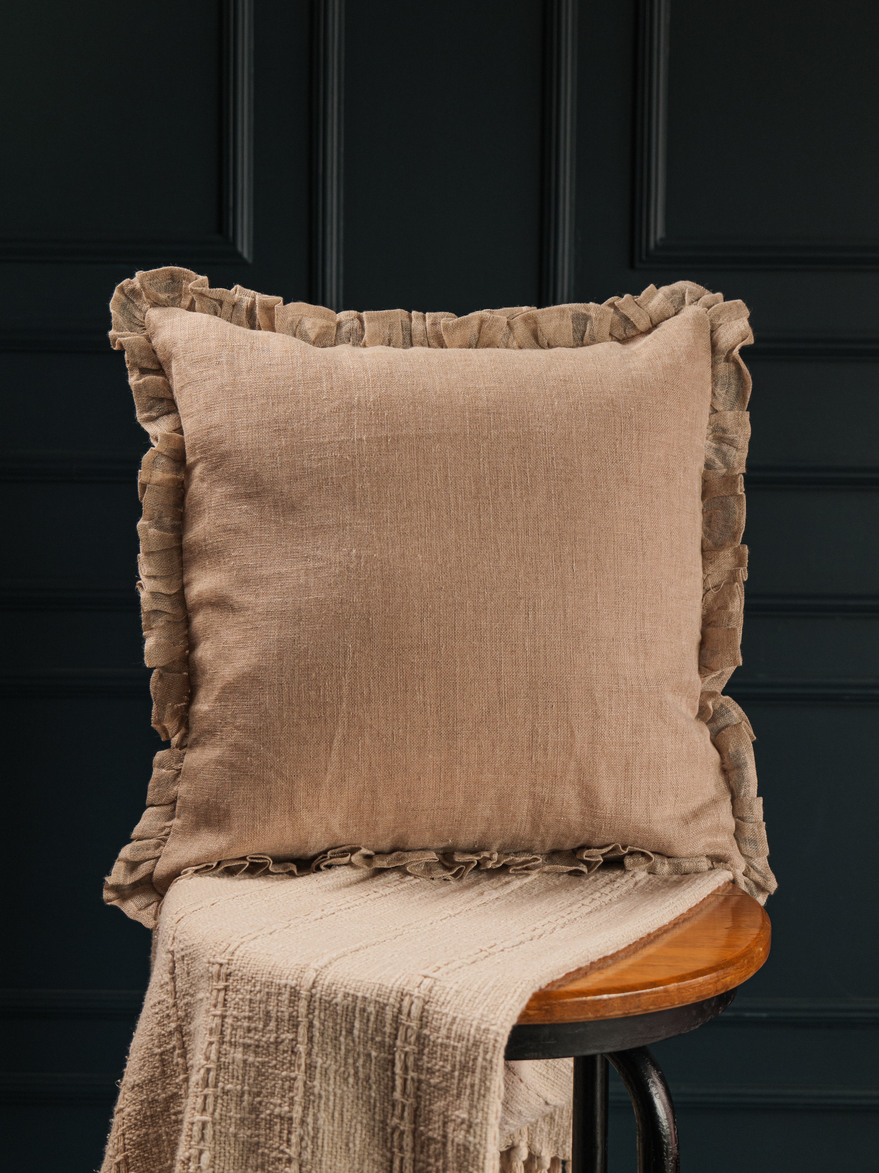 This elegant cushion cover, crafted from 100% linen, adds a touch of sophistication to any space. Measuring 16 x 16 inches, it features soft, stylish frills on all four sides, creating a charming and decorative look. The cover includes a discreet zipper for easy removal and cleaning, combining convenience with timeless design. Perfect for living rooms or bedrooms, this cushion cover blends natural texture with delicate detailing, enhancing your home décor.