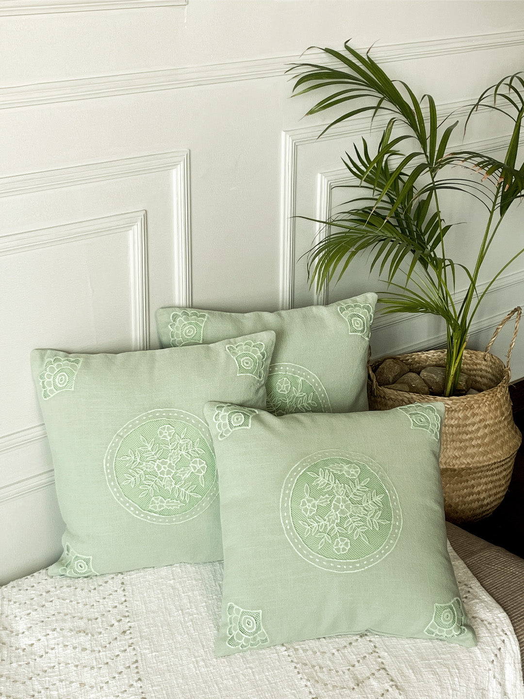 Old Charm Cut Work Cushion Cover 100% Linen Cotton - Green