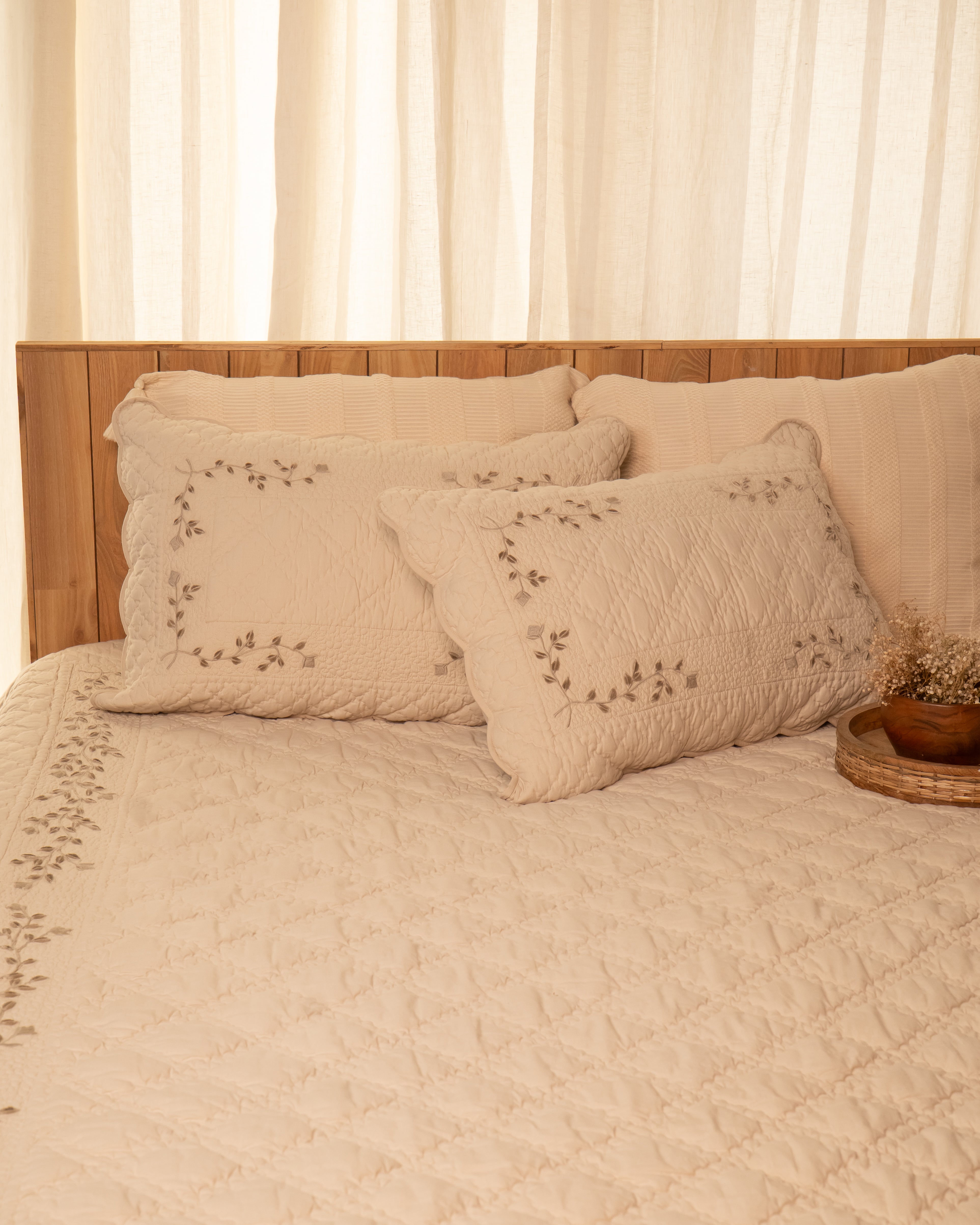 Ammorada presents its Festive & Wedding Collection – the Zoya Cutwork Embroidery Bedspread Set, designed to bring timeless sophistication and refined elegance to your home décor. Expertly crafted from 100% premium poplin cotton, this luxurious 3-piece set includes one generously sized bedspread (260 cm x 240 cm) and two matching pillow covers (28 in x 18 in). Designed in a soothing beige tone, it features elegant cutwork embroidery along all four sides of the bedspread and pillow covers, paired with intricate Italian quilting that lends a refined, textured finish. Filled with 200 GSM hypoallergenic filling, the bedspread offers a plush yet lightweight feel—perfectly balanced for cozy comfort, breathability, and long-lasting durability. Ideal for festive occasions, wedding trousseaus, or everyday elegance, the Zoya bedspread set is a celebration of fine craftsmanship and understated luxury. Transform your bedroom into a serene and stylish retreat while adding a warm, inviting charm that reflects grace, sophistication, and comfort in every detail.