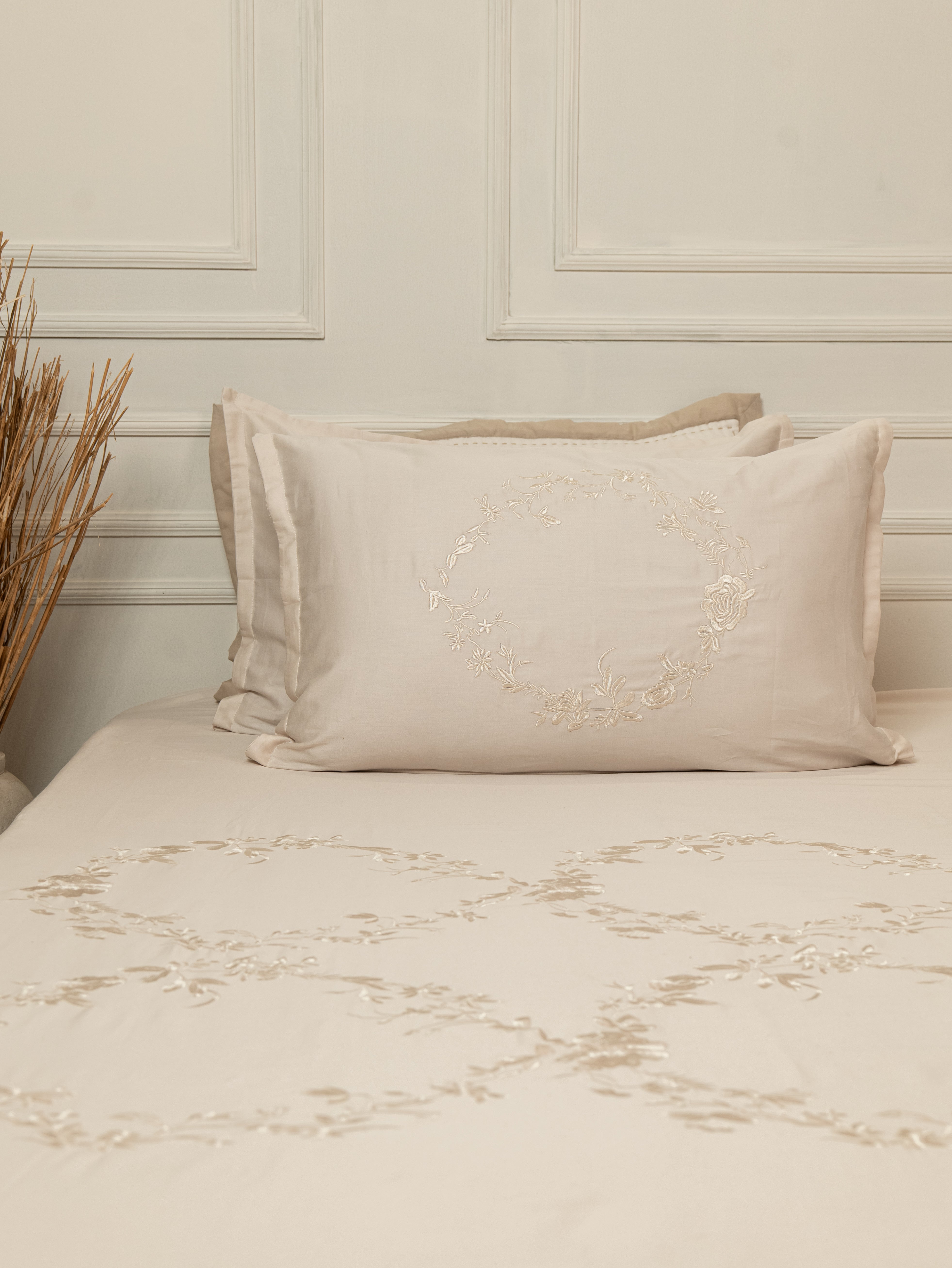 Elegant Embroidery: Delicate embroidered detailing on the bed sheet’s bottom panel and pillow covers’ center panel