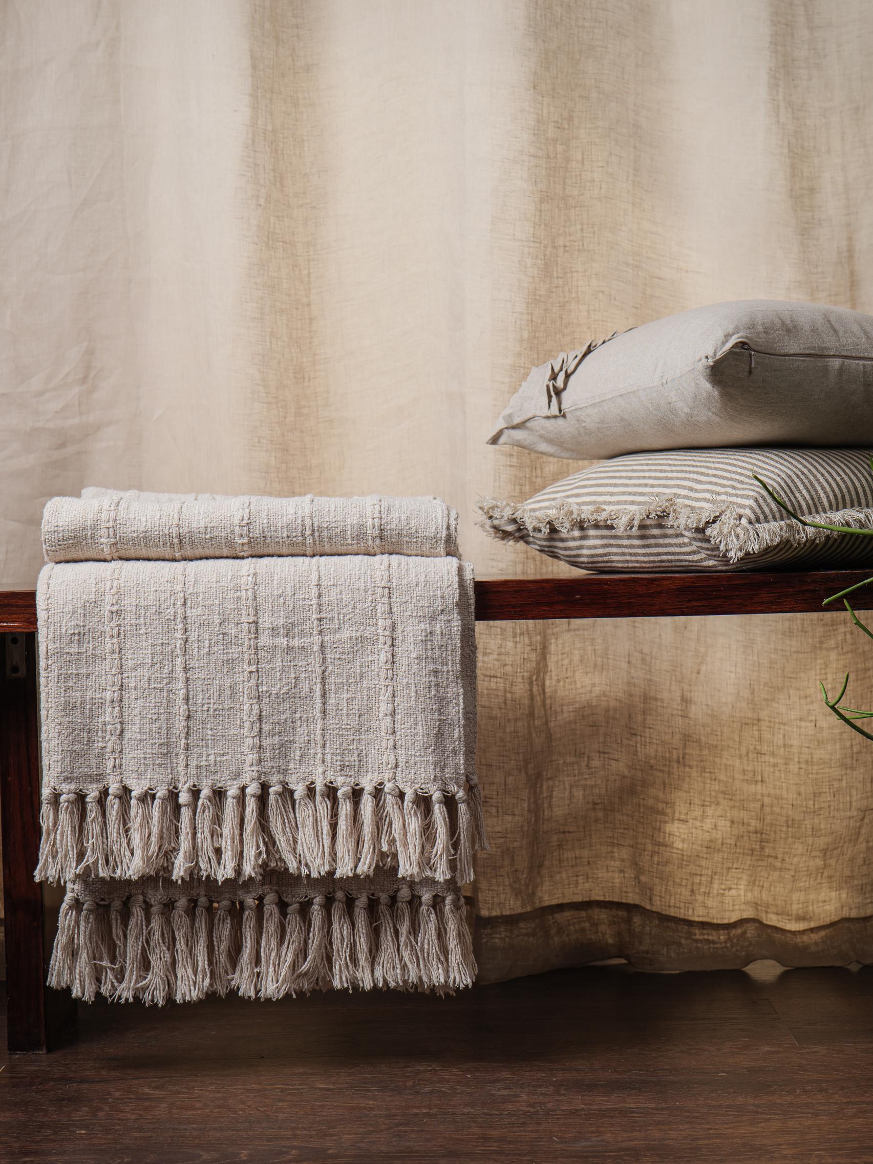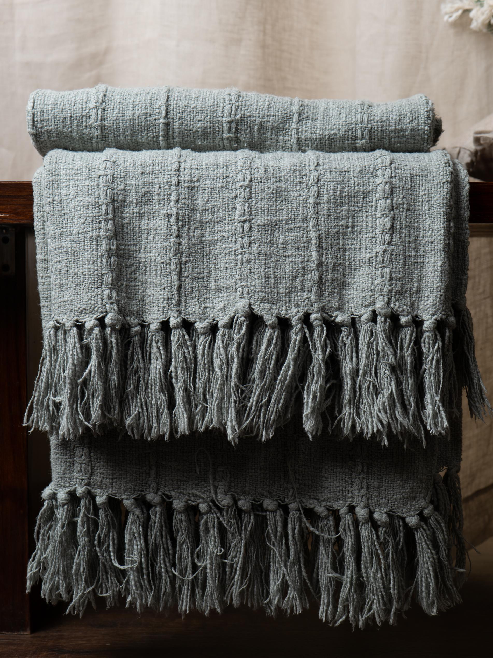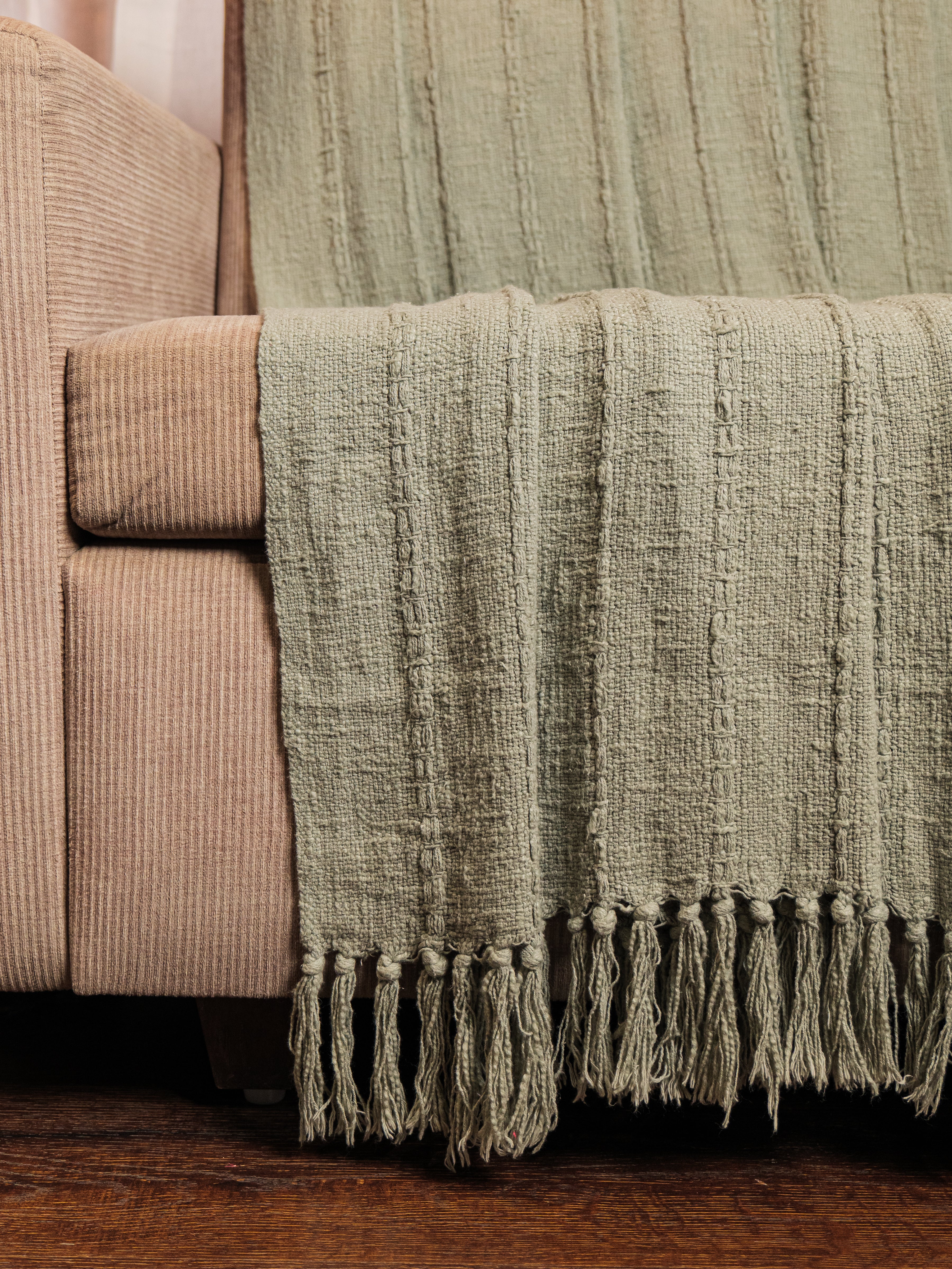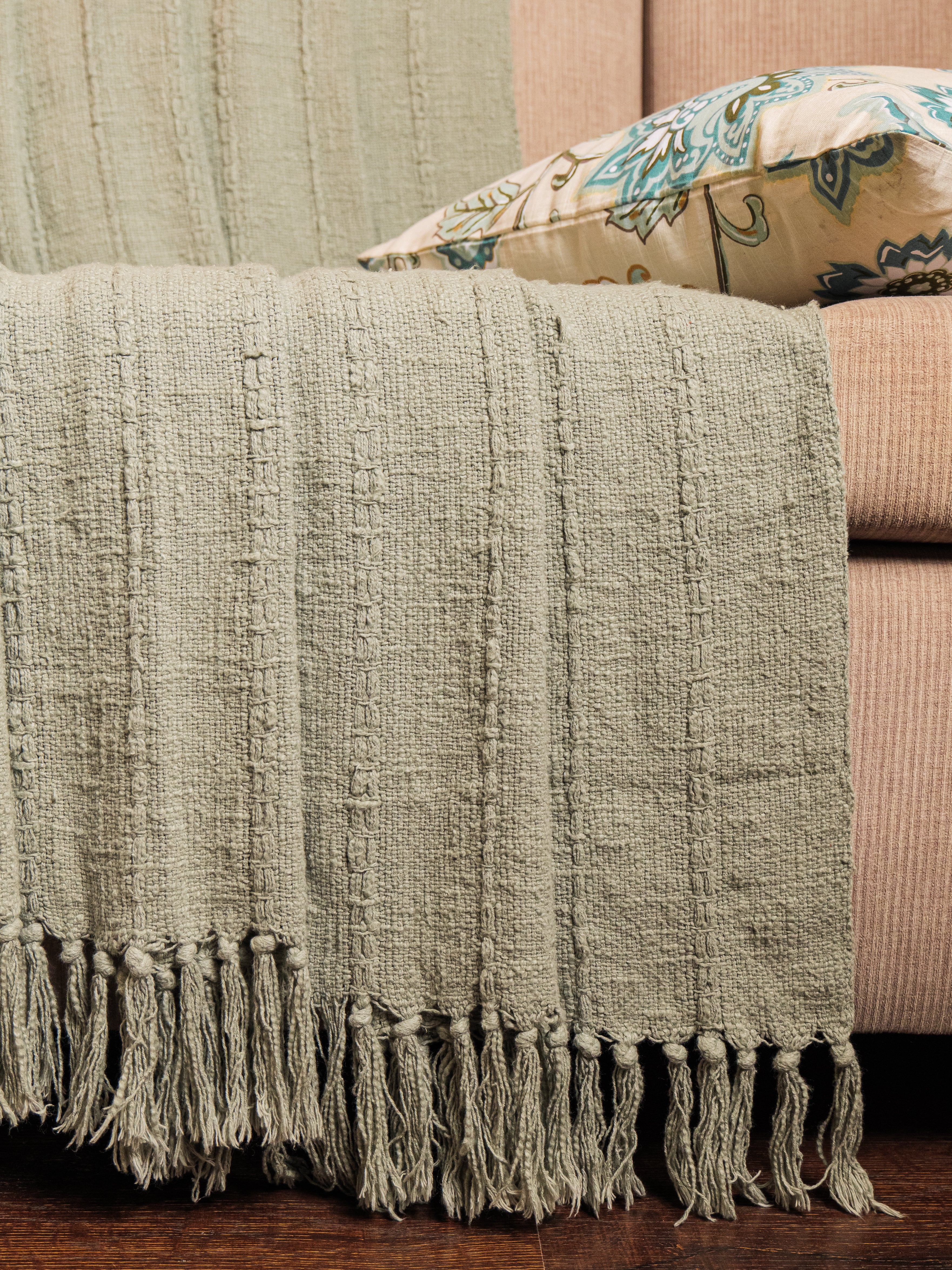 Add a touch of sophisticated comfort to your home with the Textured Cotton Woven Throw Blanket in Sage. This elegant throw is crafted from 100% premium cotton, featuring intricate textured patterns and finished with a luxurious long tassel fringe for added visual interest. Measuring a generous 260 cm x 170 cm, this versatile blanket provides ample coverage whether used on a sofa, chair, or bed.