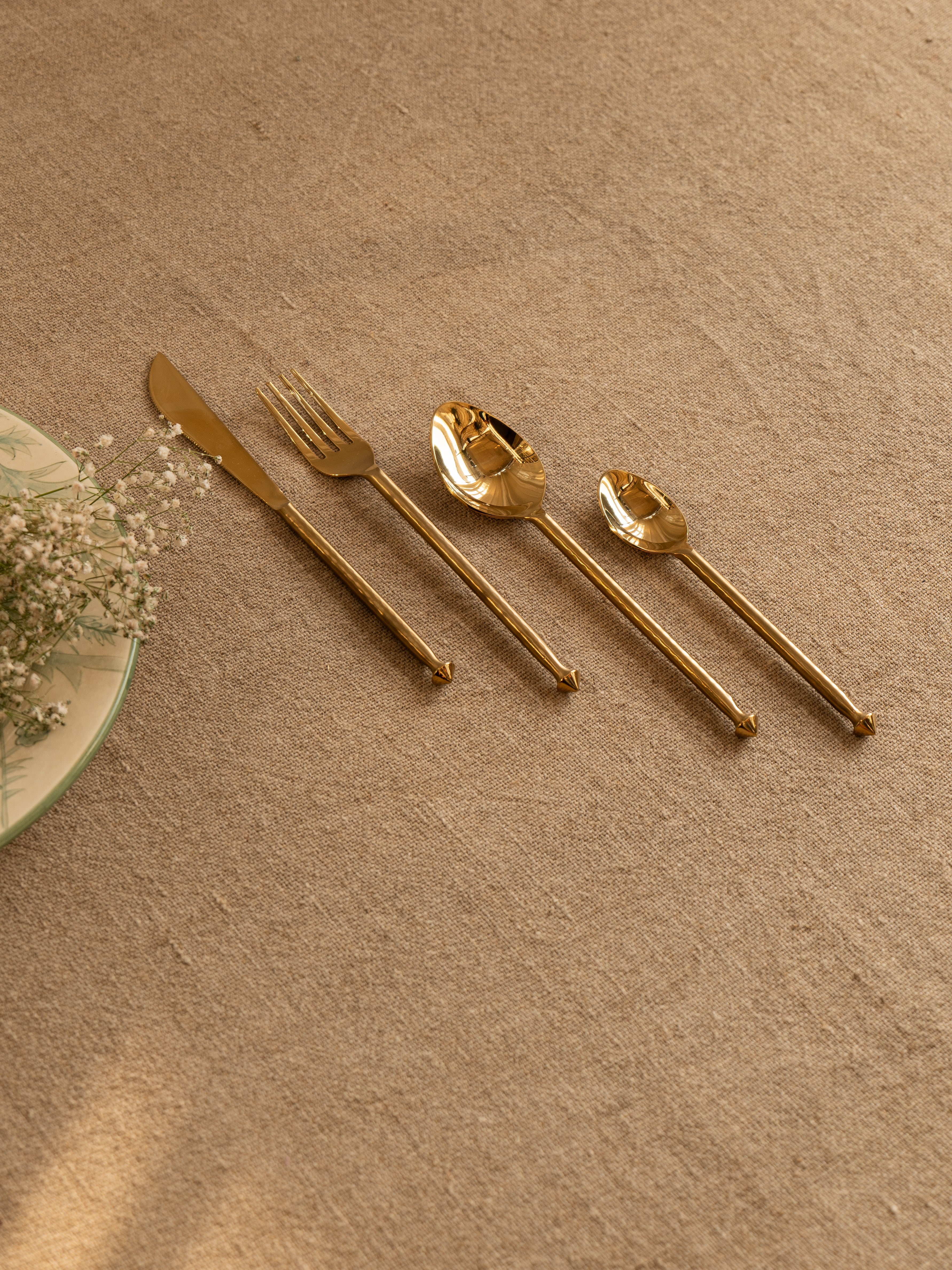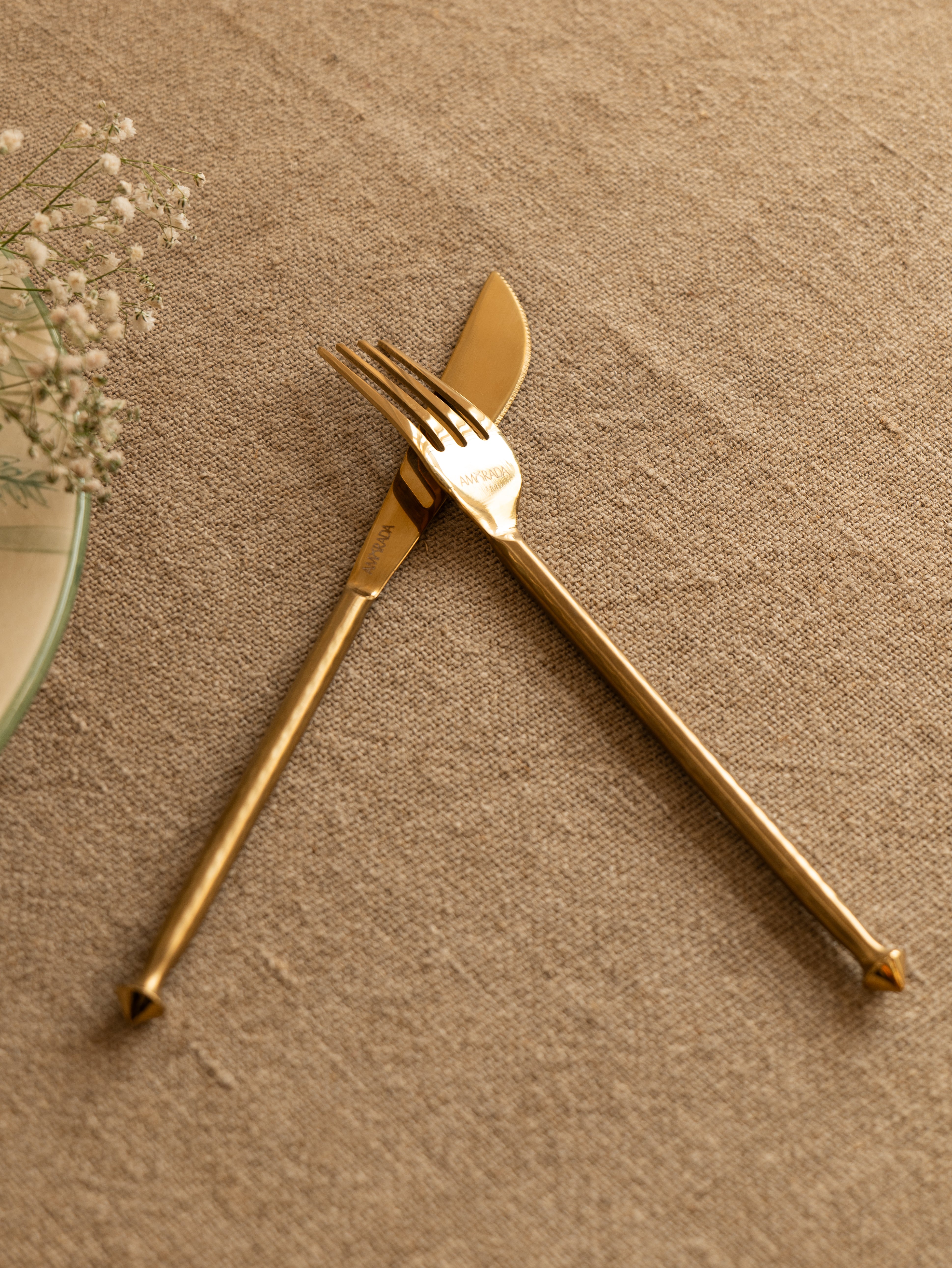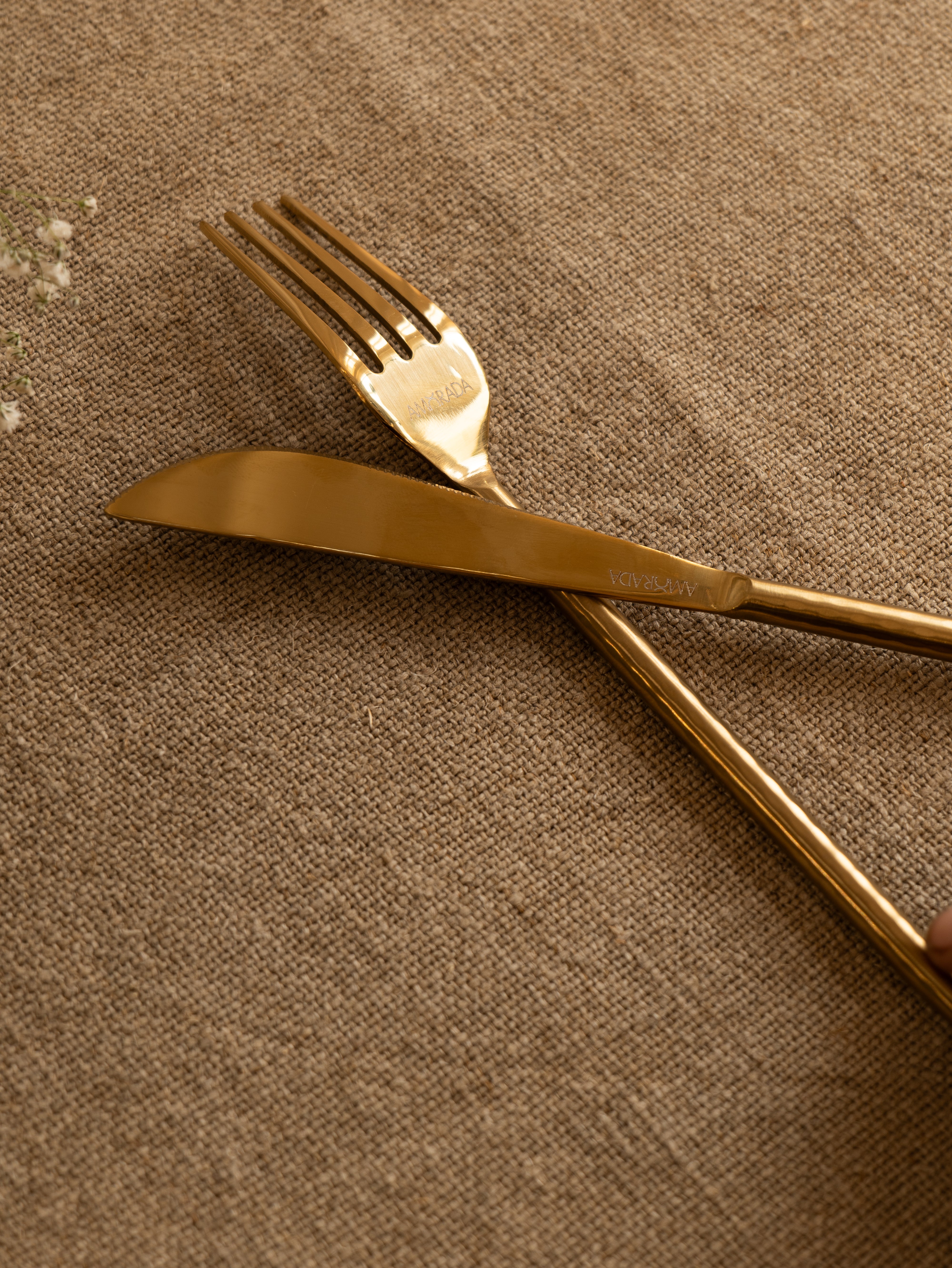 The Ballad Flatware Collection is a perfect harmony of elegance and durability, designed to enhance every dining experience. Crafted from brushed gold stainless steel with a luxurious glossy matte PVD finish, it seamlessly complements both modern and classic table settings. Each piece is meticulously handcrafted, offering comfort, balance, and sophistication with a refined play of textures that highlight its beauty and functionality. Available in 16- or 24-piece sets, including dinner forks, knives, tablespoons, and teaspoons, it provides all the dining essentials. Presented in an elegant branded gift box, the Ballad Flatware makes a luxurious gift for weddings, housewarmings, or special occasions.