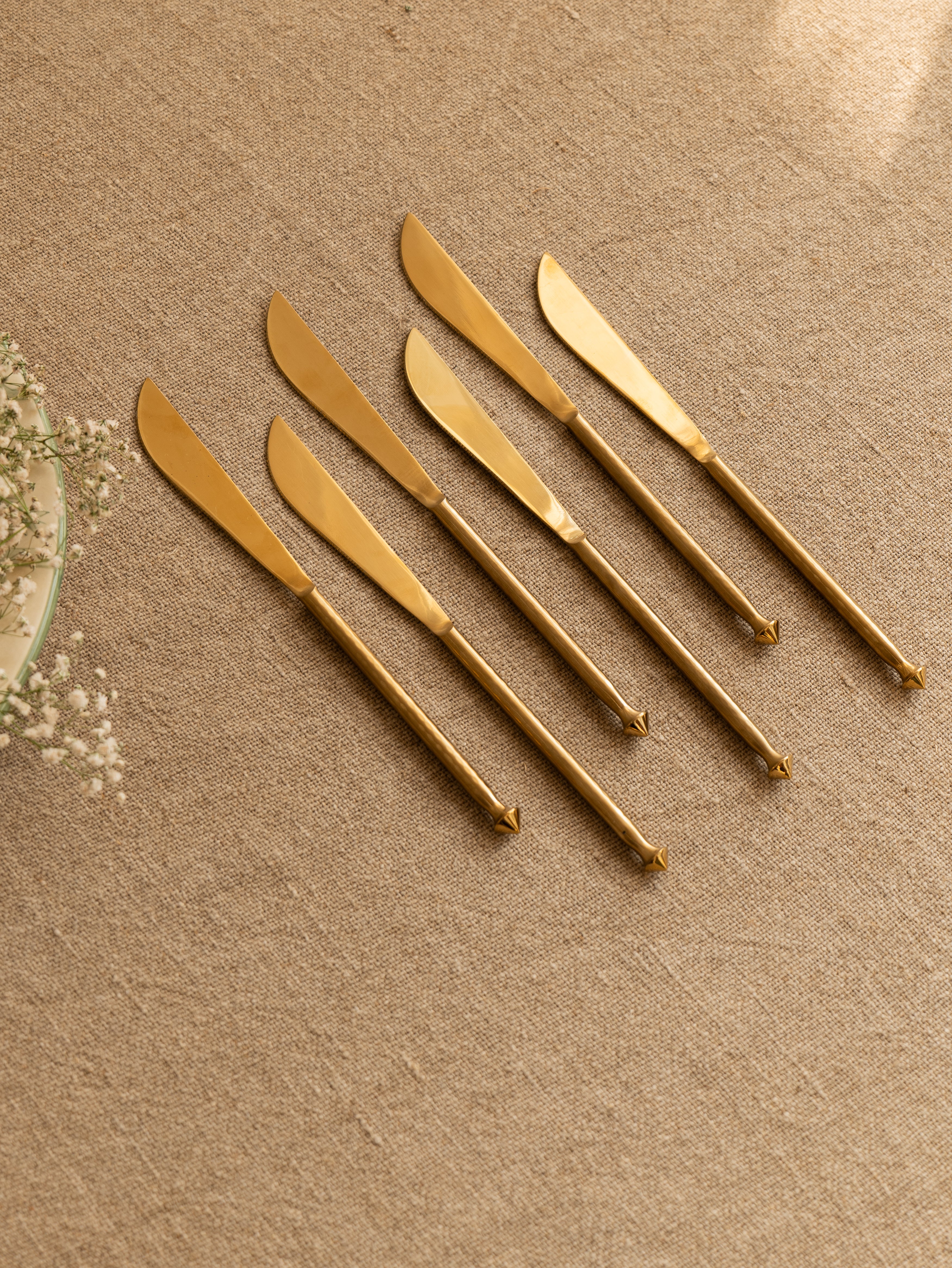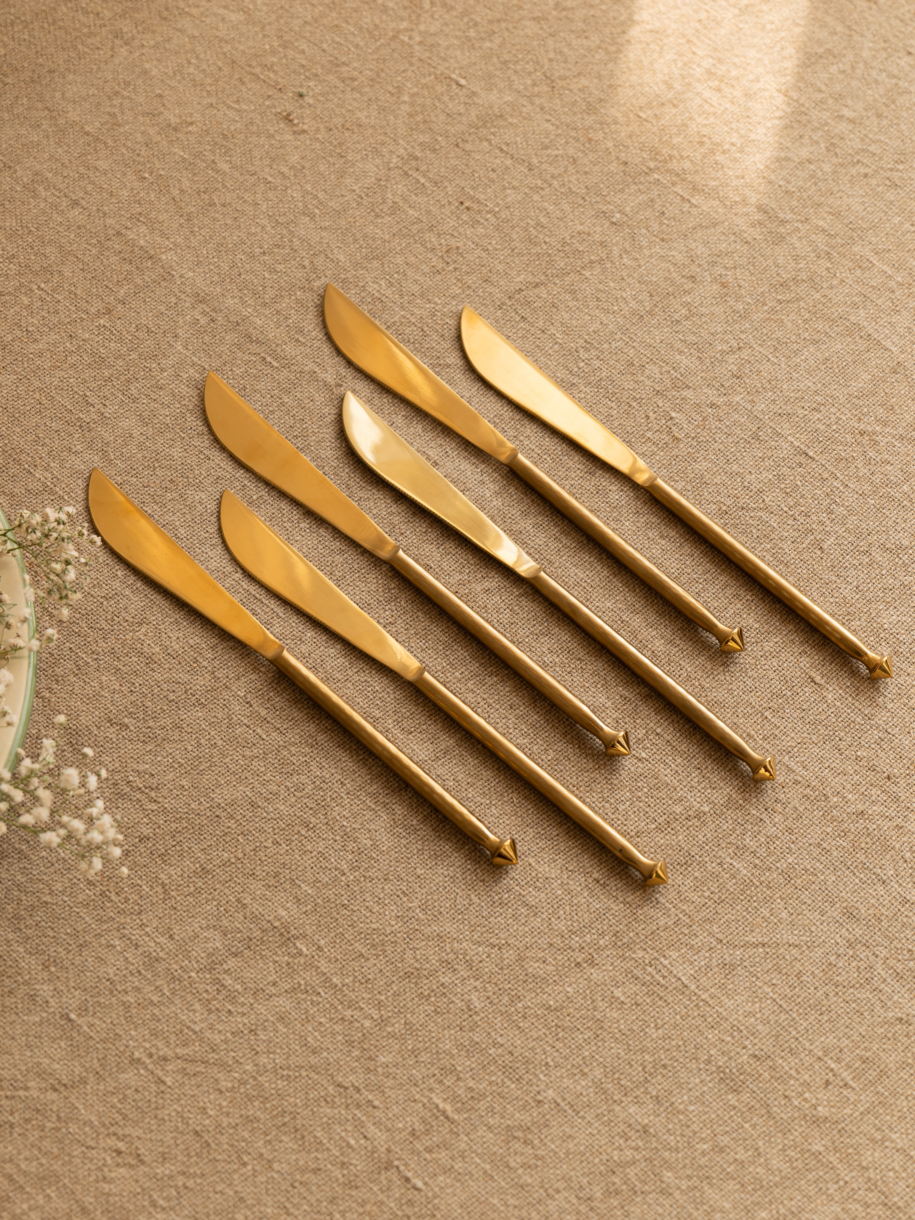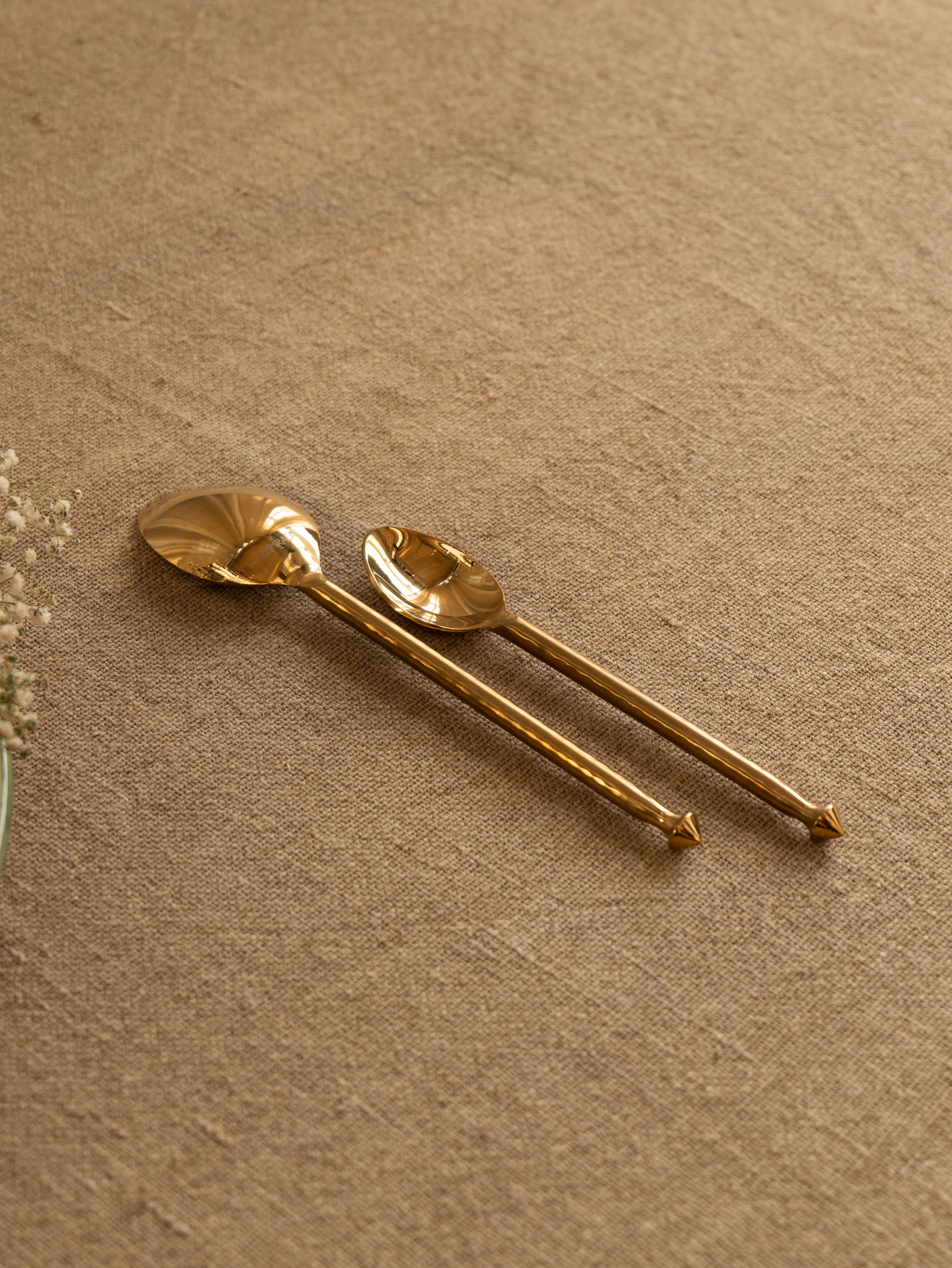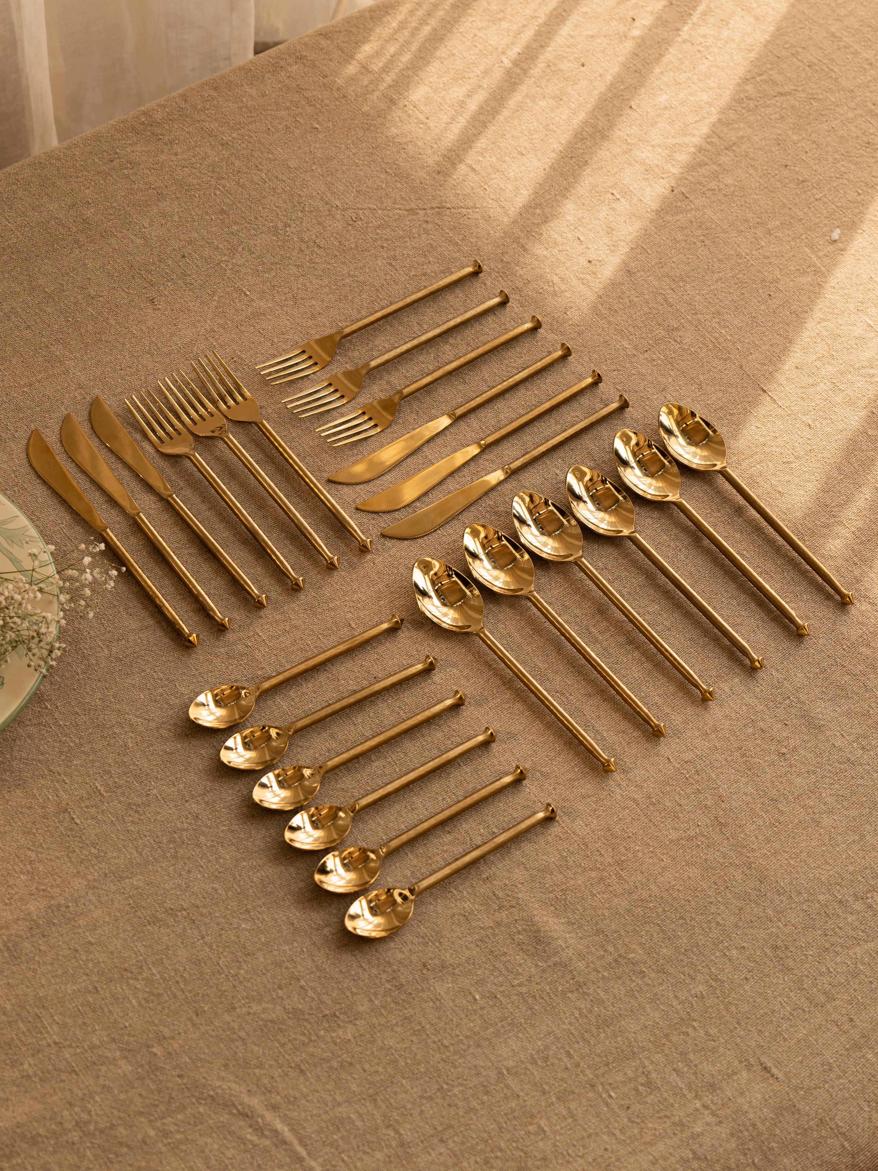 The Ballad Flatware Collection is a perfect harmony of elegance and durability, designed to enhance every dining experience. Crafted from brushed gold stainless steel with a luxurious glossy matte PVD finish, it seamlessly complements both modern and classic table settings. Each piece is meticulously handcrafted, offering comfort, balance, and sophistication with a refined play of textures that highlight its beauty and functionality. Available in 16- or 24-piece sets, including dinner forks, knives, tablespoons, and teaspoons, it provides all the dining essentials. Presented in an elegant branded gift box, the Ballad Flatware makes a luxurious gift for weddings, housewarmings, or special occasions.