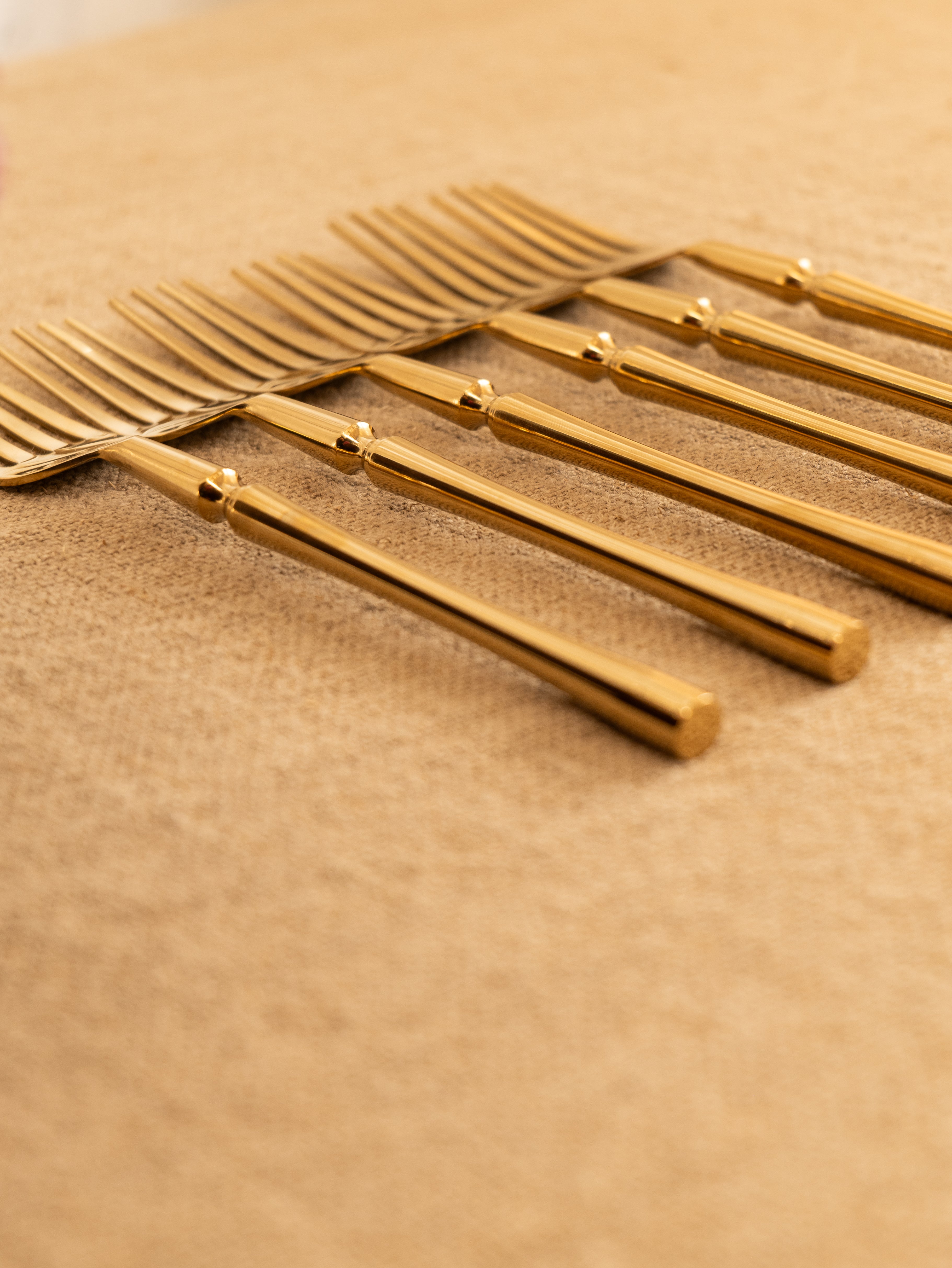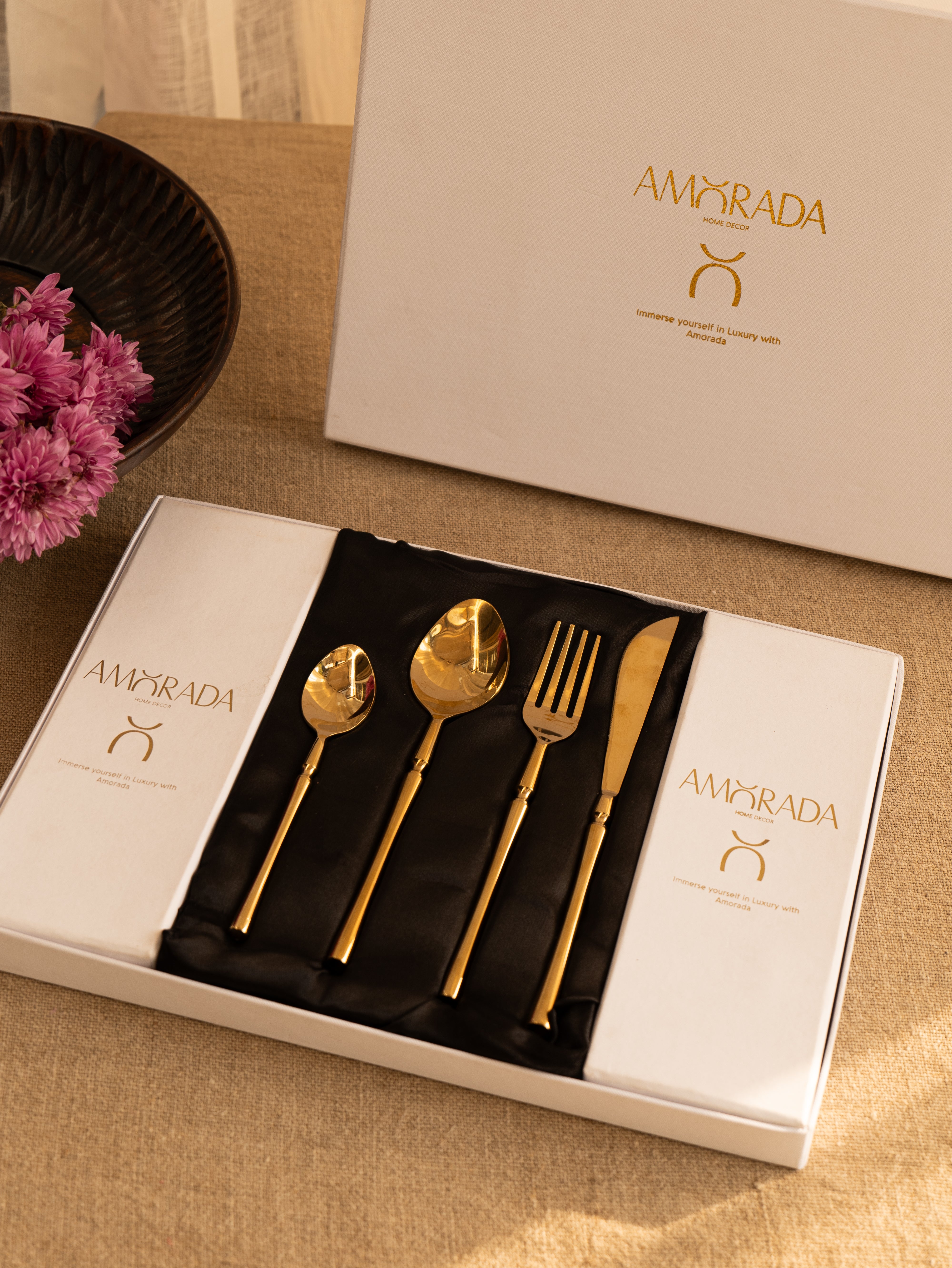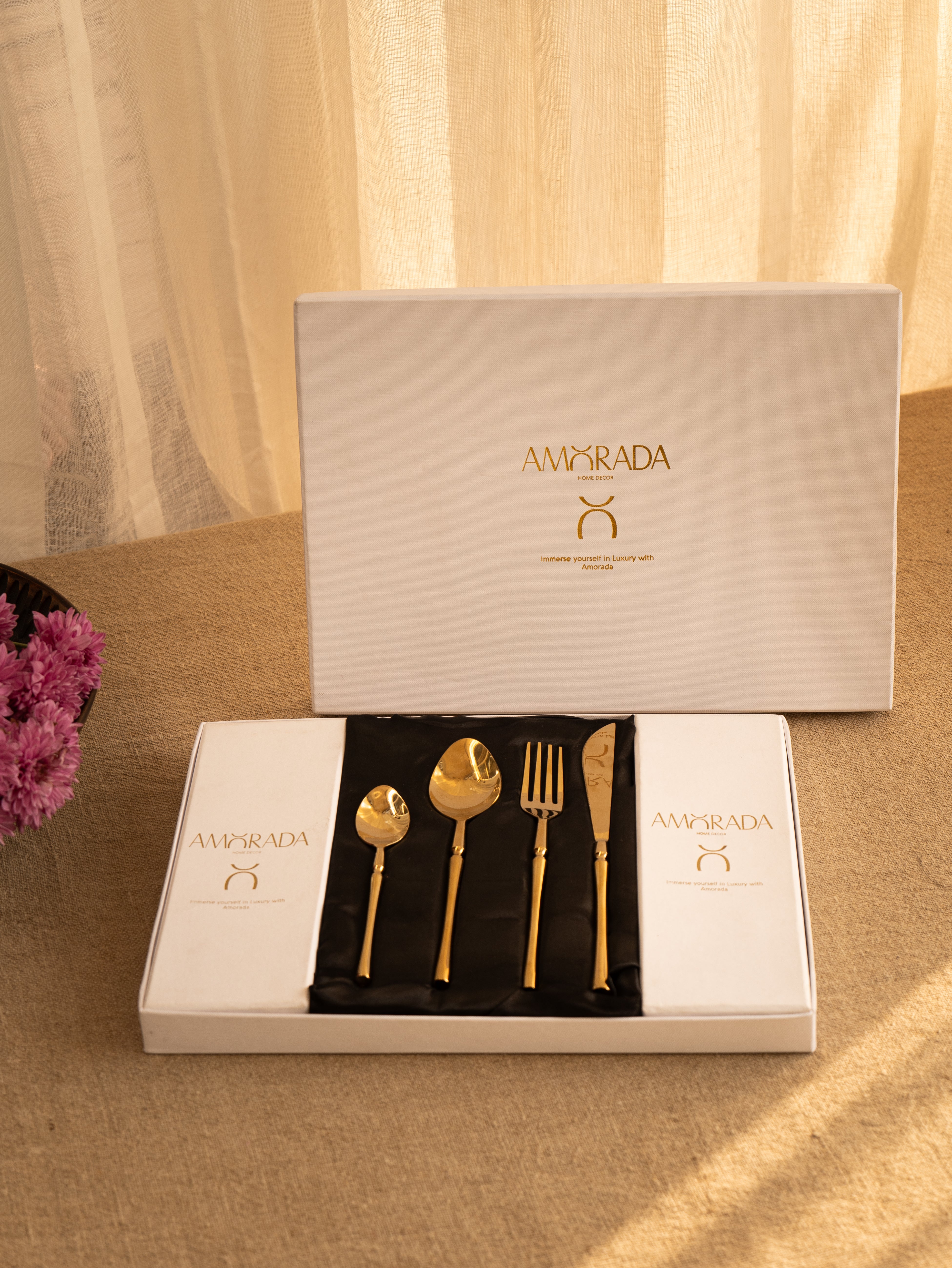 The Sestina Flatware Collection embodies timeless elegance and modern craftsmanship, designed to elevate every dining occasion. Crafted from brushed gold stainless steel with a luxurious glossy matte PVD finish, each piece blends durability with sophistication, making it suitable for both classic and contemporary settings. Handcrafted with precision, the flatware offers comfort, balance, and refined detailing, ensuring both beauty and functionality. Available in 16- or 24-piece sets, including dinner forks, dinner knives, tablespoons, and teaspoons, it provides all the dining essentials. Presented in an elegant branded gift box, the Sestina Flatware makes an ideal gift for weddings, housewarmings, or luxury celebrations.