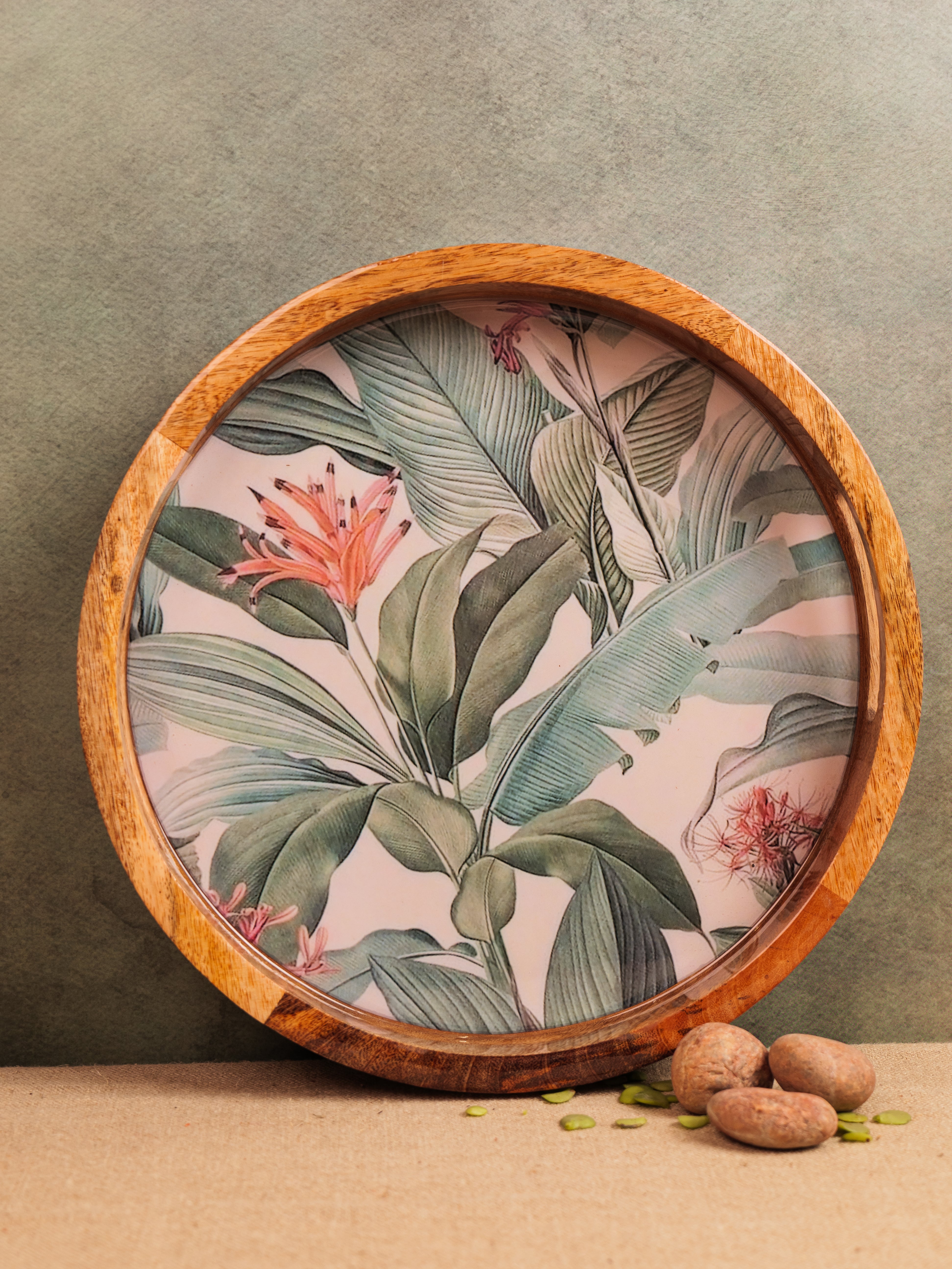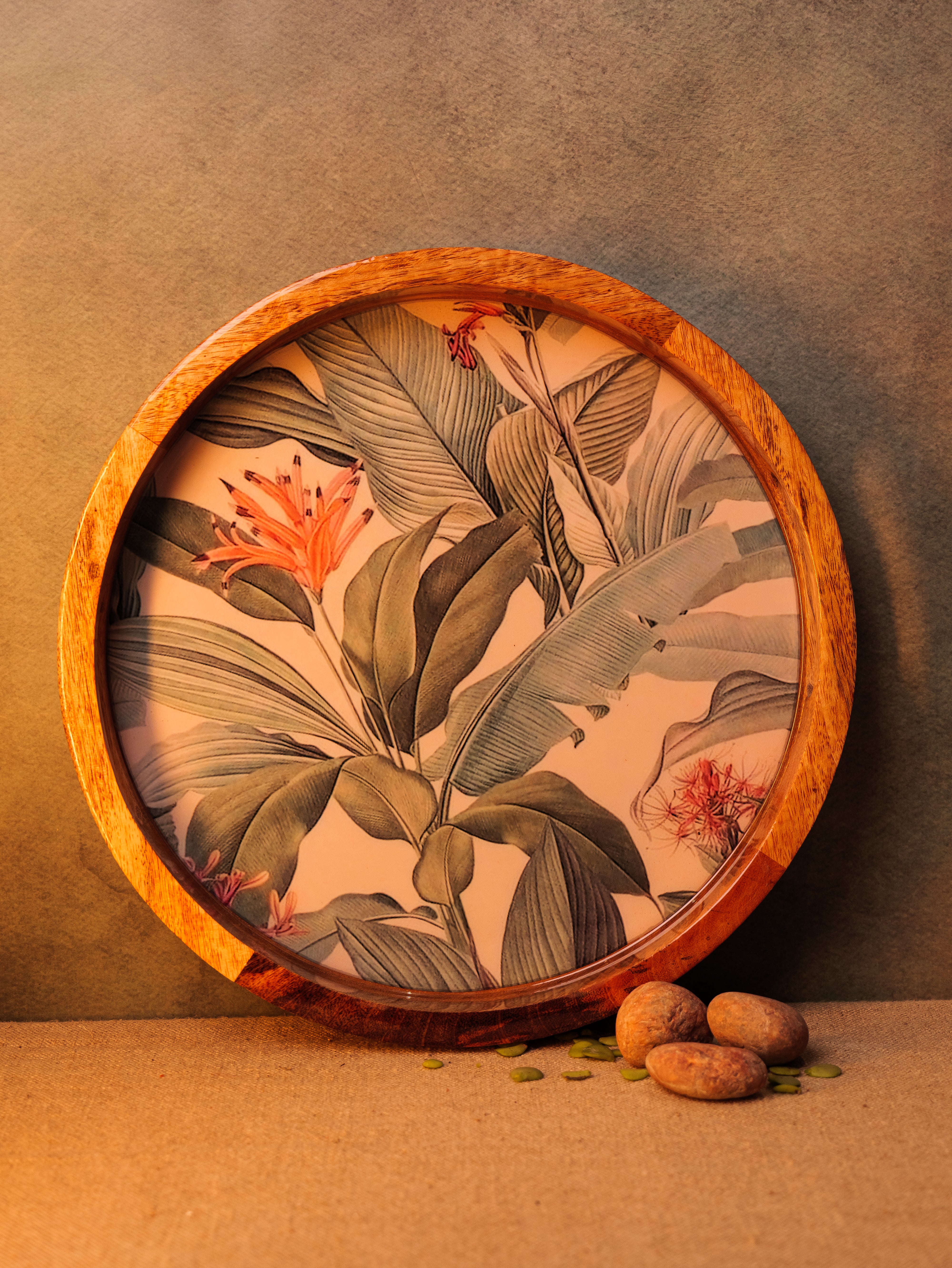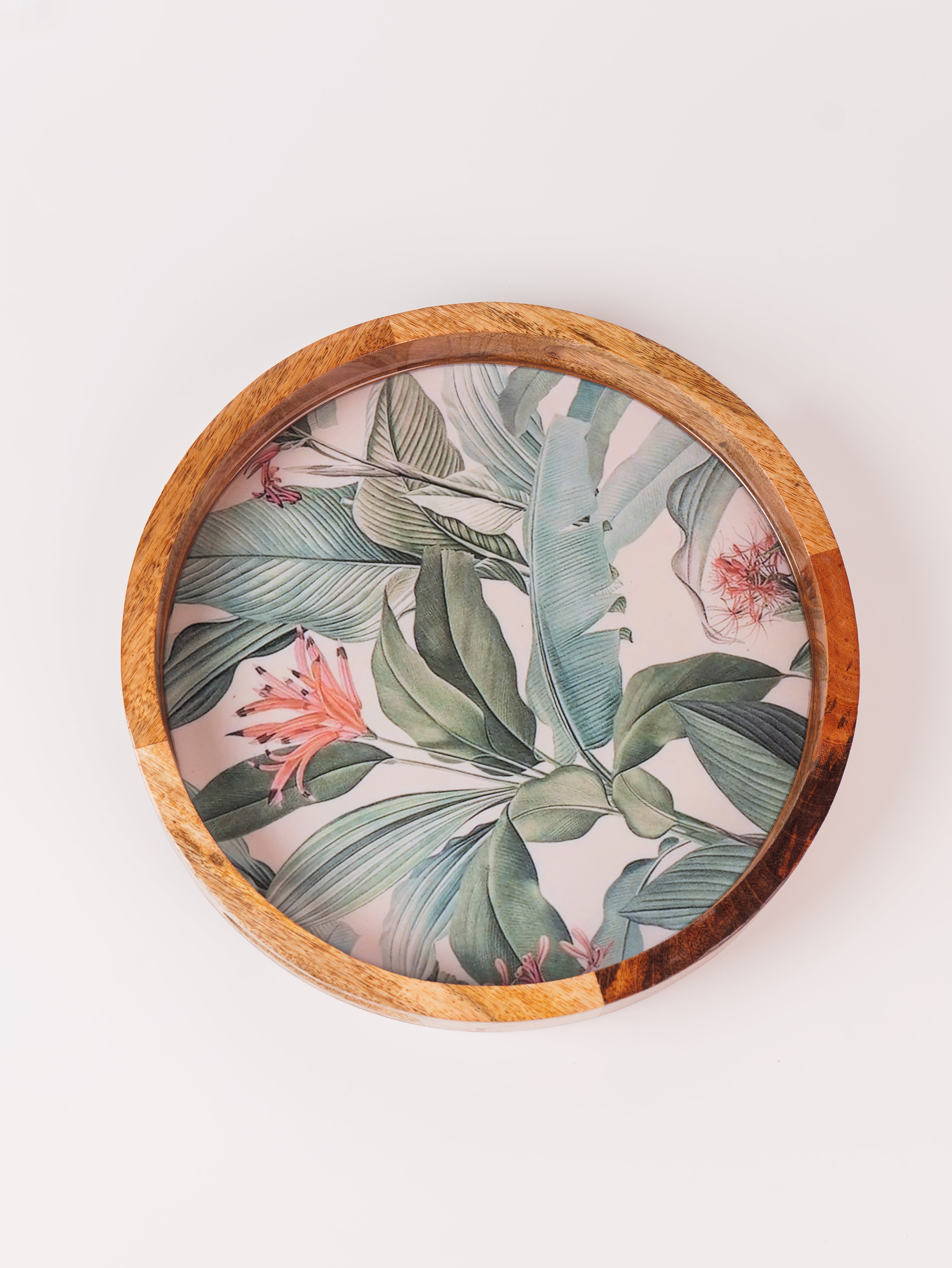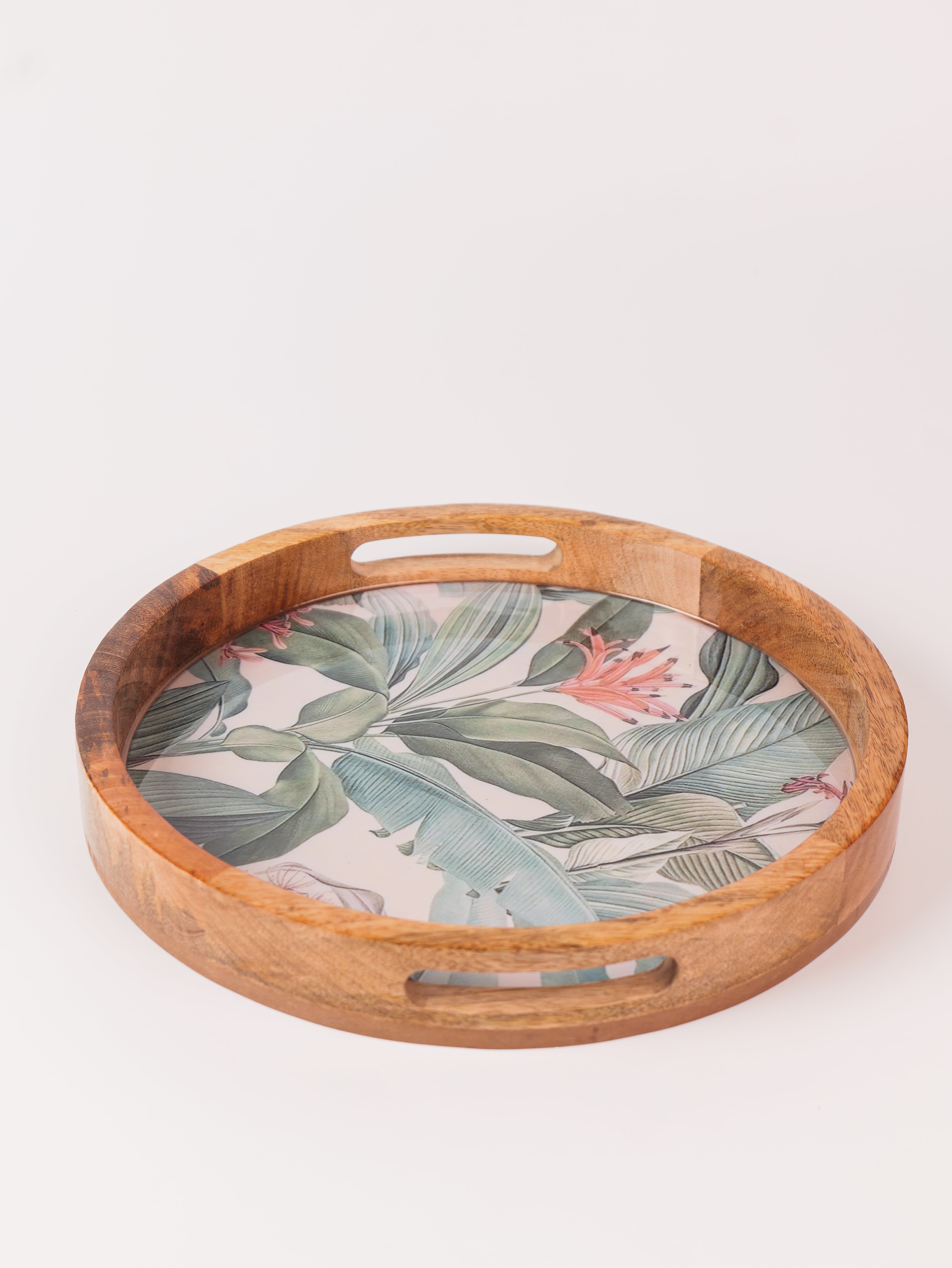 Elevate your serving experience with the Forest Walk Epoxy Tray, beautifully handcrafted from premium mango wood. This round tray (14" x 14") showcases a mesmerizing forest walk leaf design, meticulously crafted with food-grade epoxy resin, blending nature’s charm with artistic elegance. Its smooth finish and sturdy construction make it perfect for serving beverages, snacks, or desserts in style. The tray’s natural wood grain, combined with the vibrant epoxy detailing, adds a unique aesthetic touch to any setting. Ideal for both everyday use and special occasions, this tray is a perfect fusion of functionality, durability, and exquisite craftsmanship.