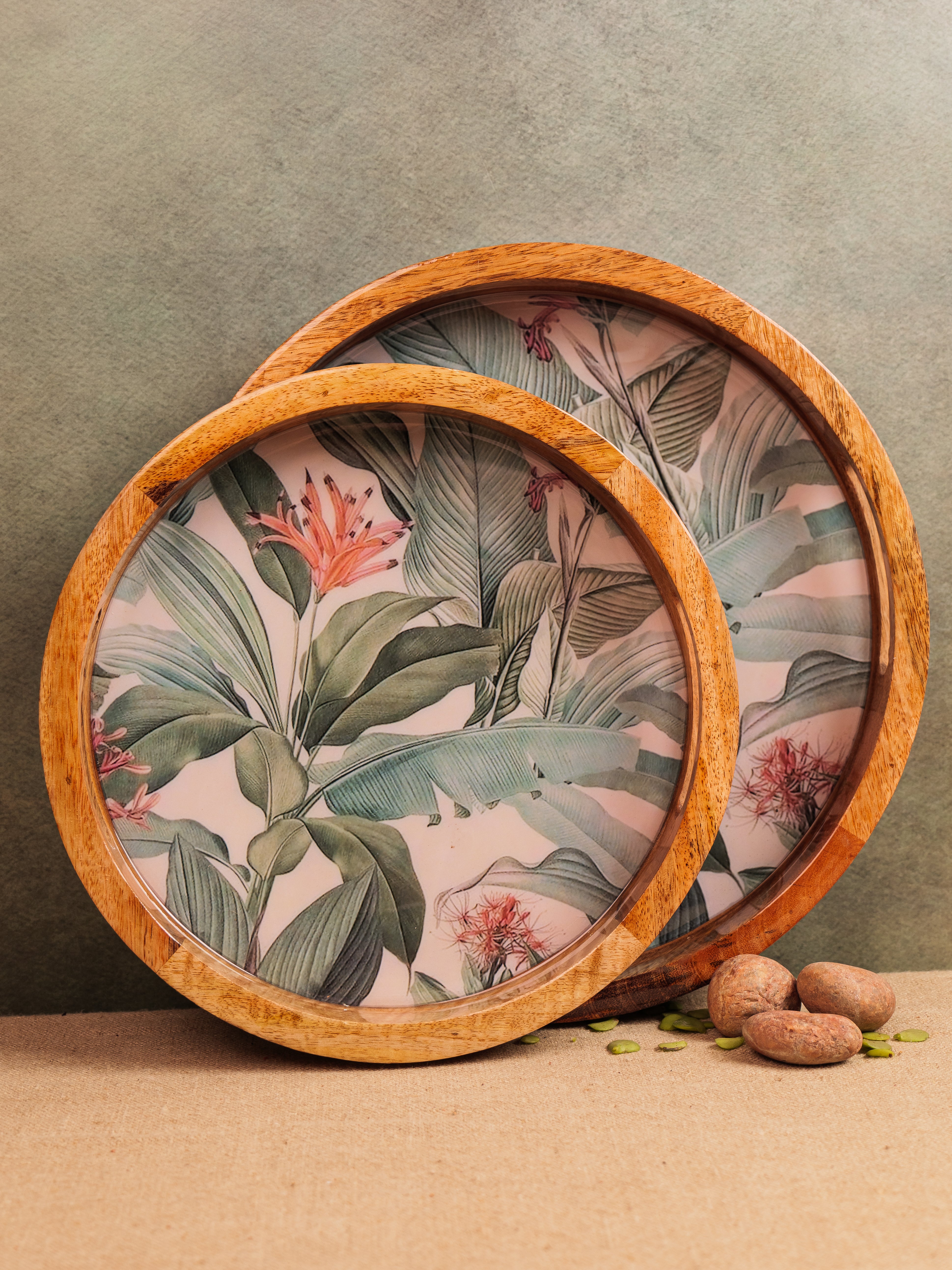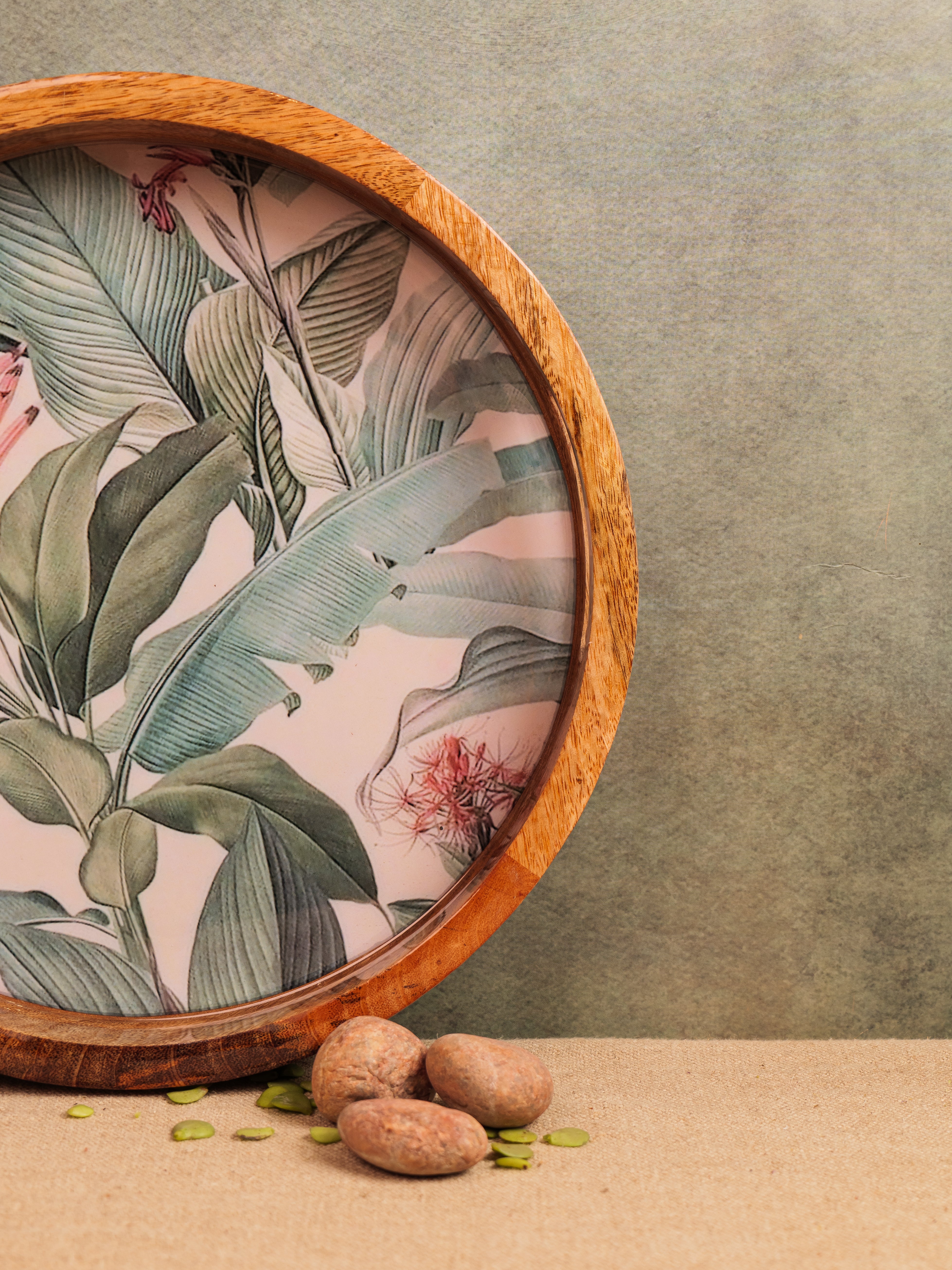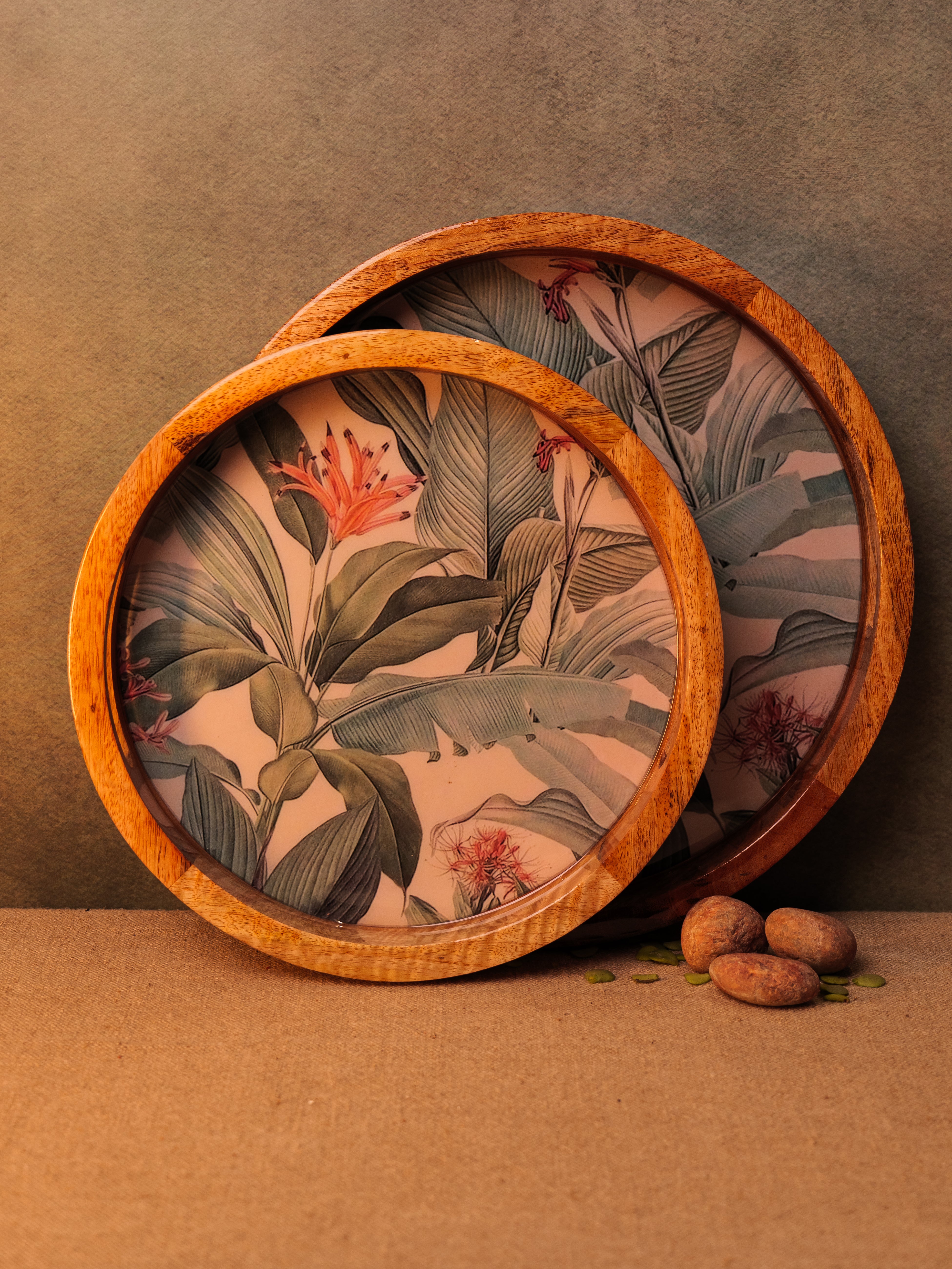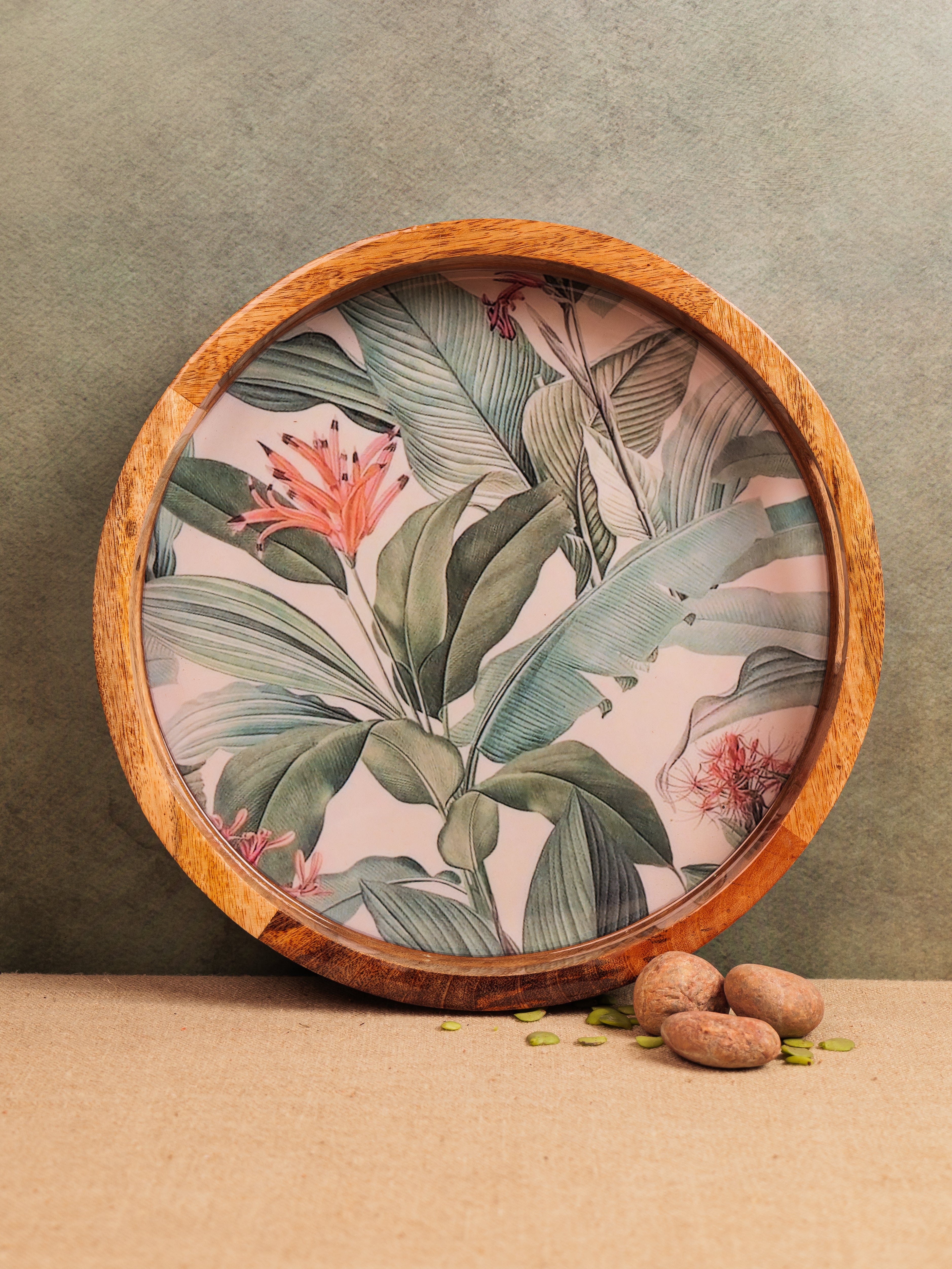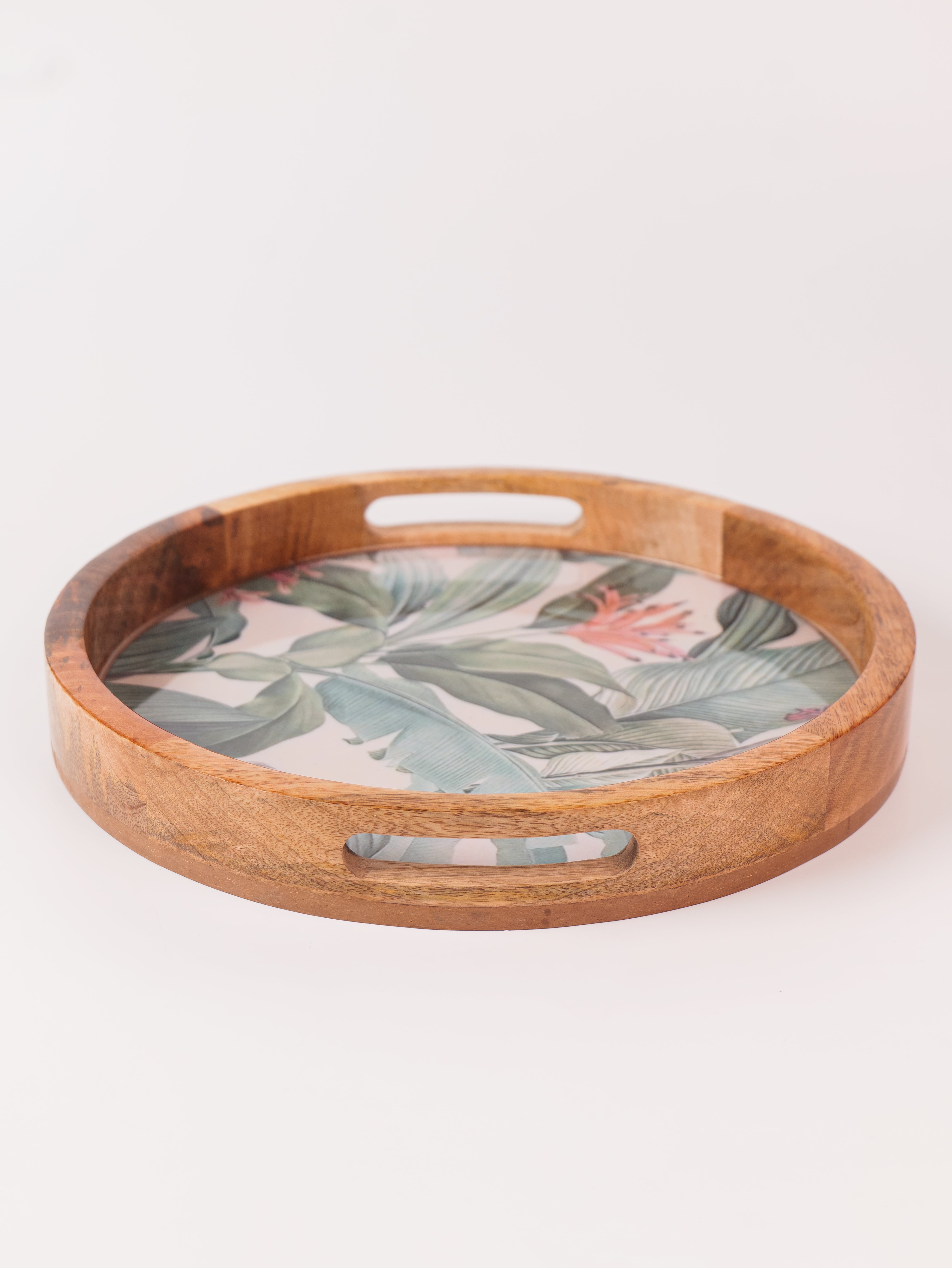 Elevate your serving experience with the Forest Walk Epoxy Tray, beautifully handcrafted from premium mango wood. This round tray (14" x 14") showcases a mesmerizing forest walk leaf design, meticulously crafted with food-grade epoxy resin, blending nature’s charm with artistic elegance. Its smooth finish and sturdy construction make it perfect for serving beverages, snacks, or desserts in style. The tray’s natural wood grain, combined with the vibrant epoxy detailing, adds a unique aesthetic touch to any setting. Ideal for both everyday use and special occasions, this tray is a perfect fusion of functionality, durability, and exquisite craftsmanship.