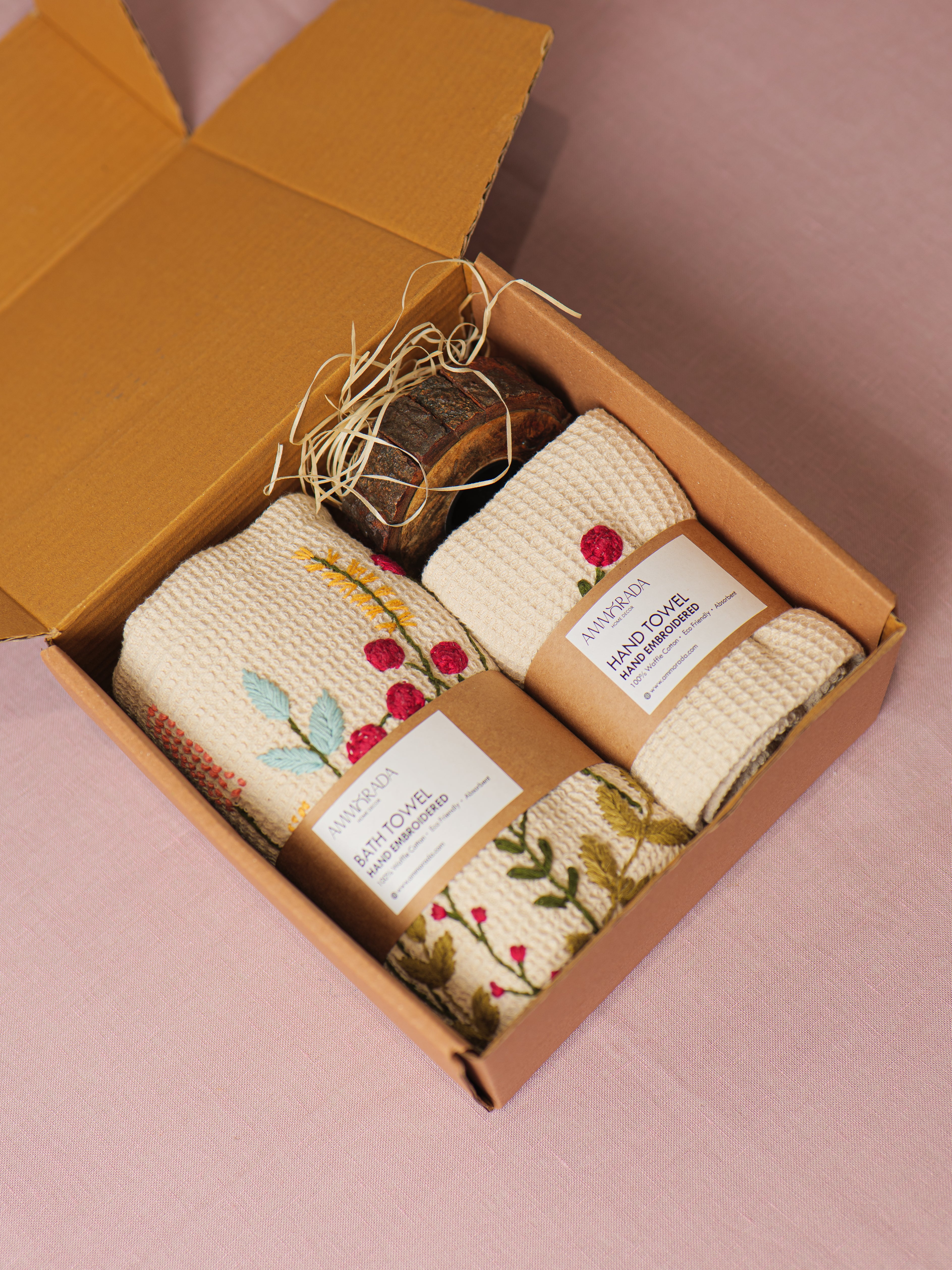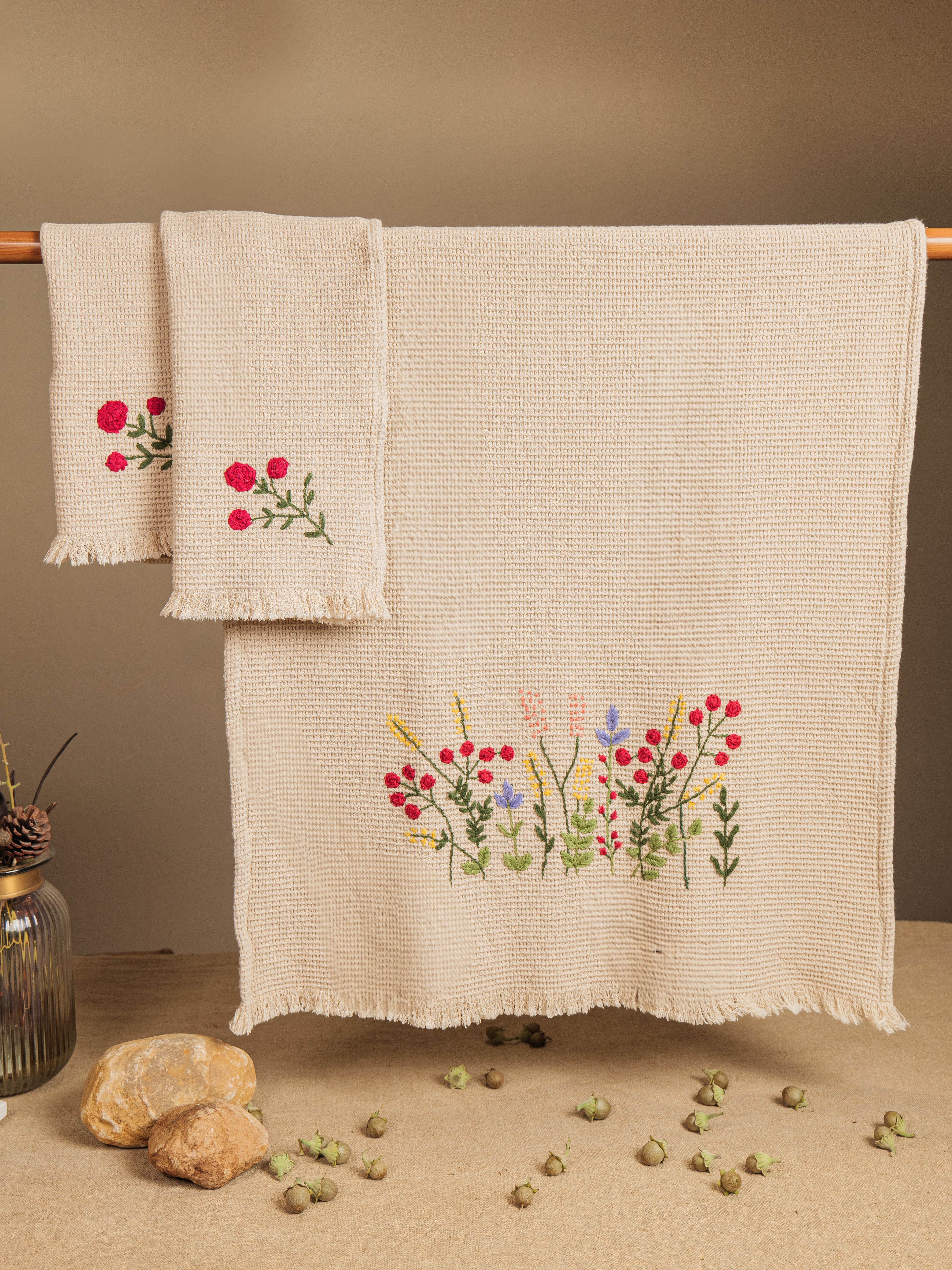 - 1 pc Bathing Towel (75x150 cm) – crafted from 100% pure waffle cotton, soft, absorbent, and hand-embroidered with floral motifs