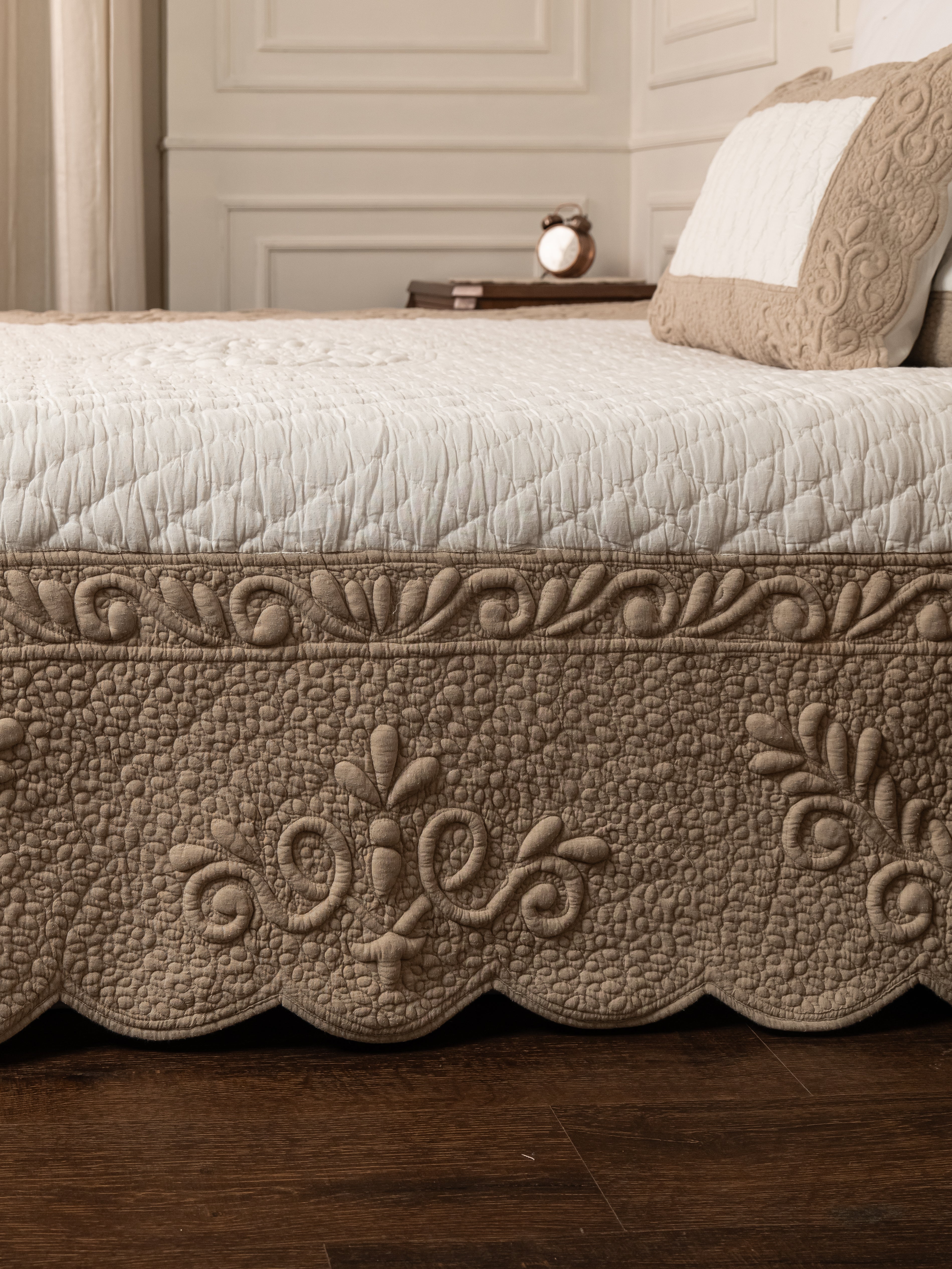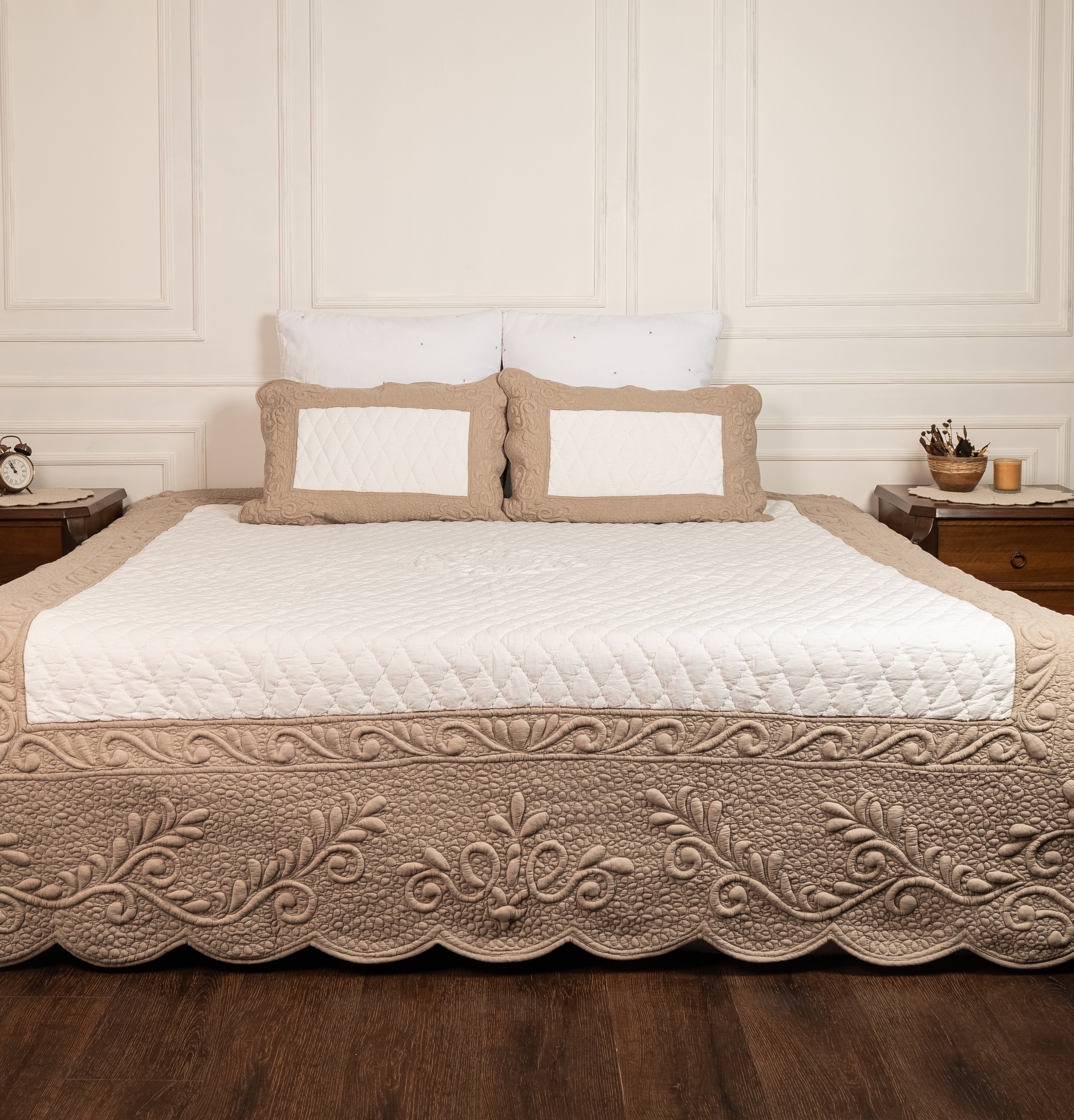 Redefine your bedroom with the Ammorada Saphora Dune Bed Spread, a luxurious blend of craftsmanship, comfort, and timeless design. Crafted from 100% soft poplin cotton, this king-size spread offers a smooth, breathable texture and lasting durability. The highlight of the design lies in its intricately quilted border with Italian quilting technique, adding plush volume and texture, while the centre is hand-quilted with 200 GSM hypoallergenic filling for a perfectly balanced feel—cozy yet lightweight. The scalloped edges enhance its refined look, while the two-tone ivory and latte colour palette introduces versatile elegance that complements both contemporary and classic interiors.