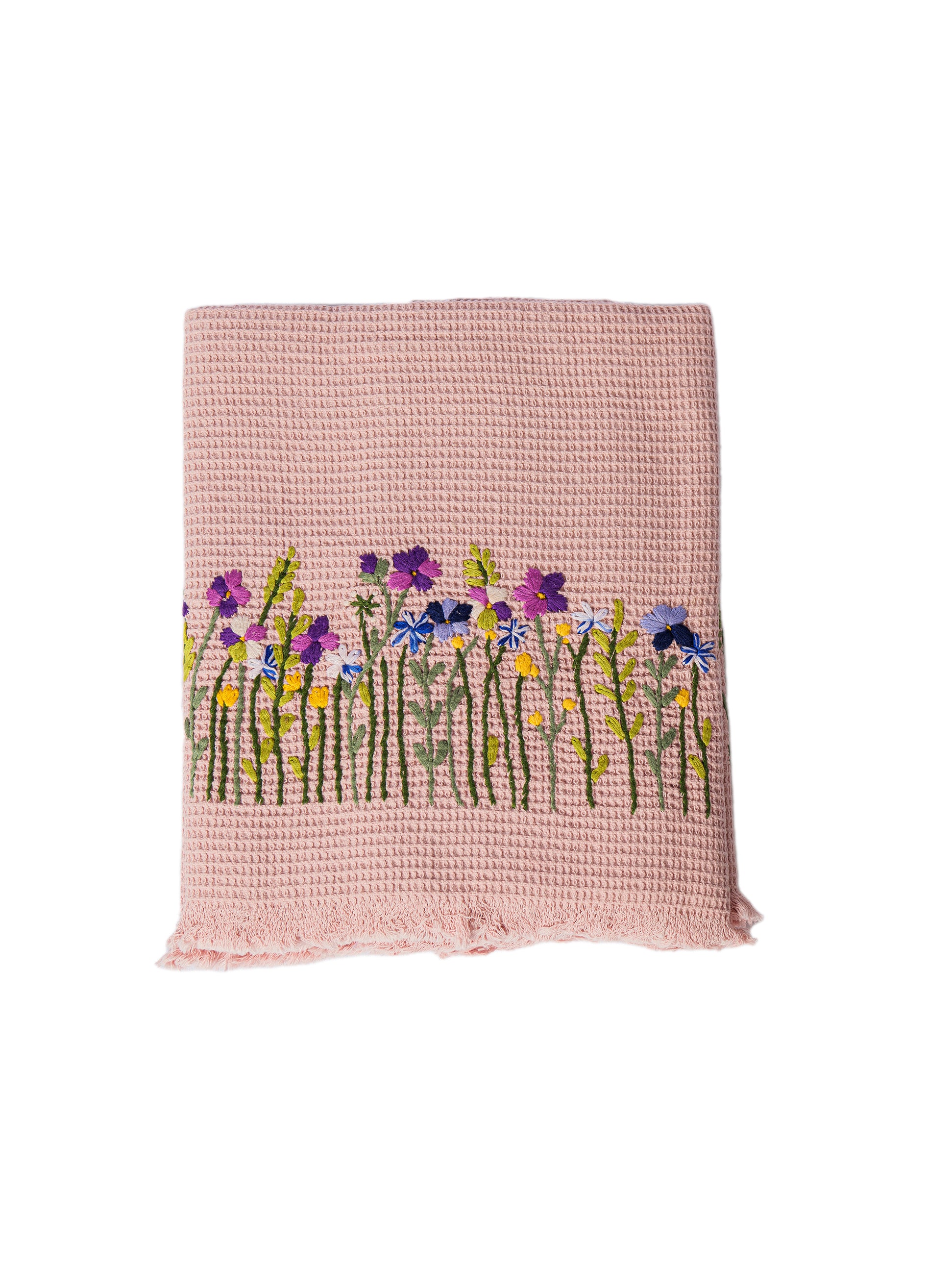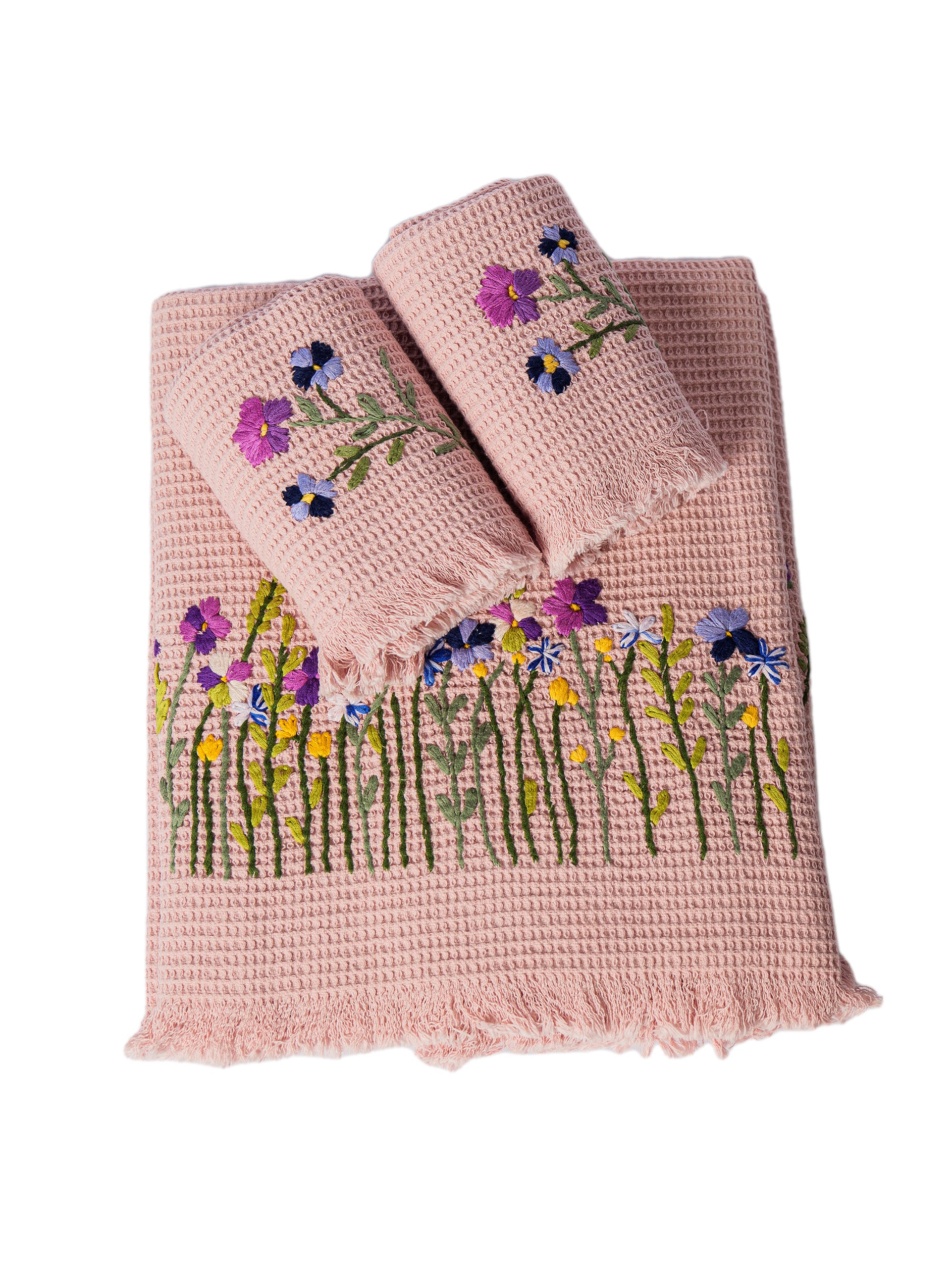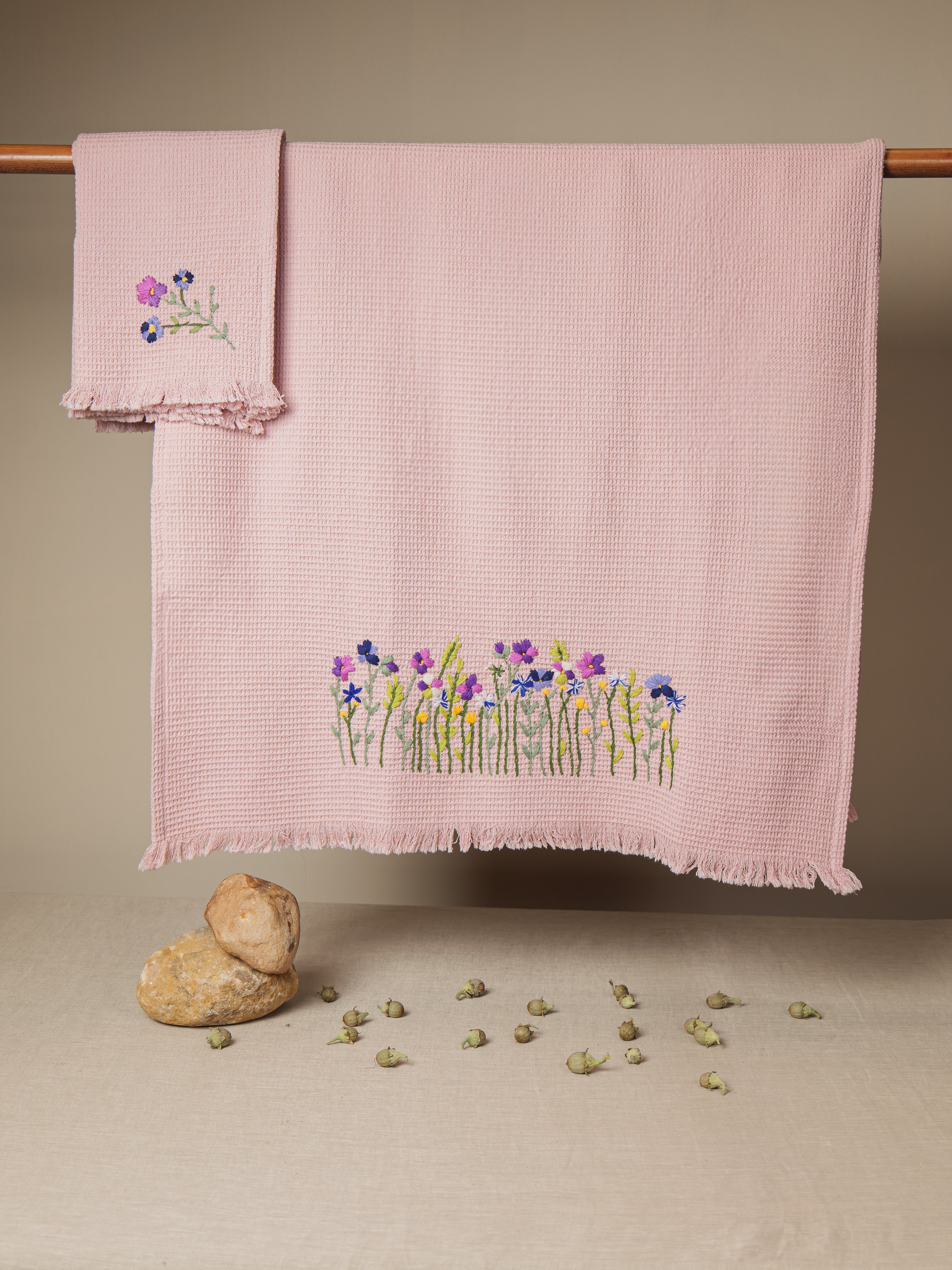 Pair these pink towels with white or neutral bathroom accessories for a fresh, clean look, or combine with complementary pastel tones for a soft, coordinated aesthetic. Their gentle texture and beautiful design make them both practical and decorative. Upgrade your daily routine with this embroidered waffle towel set, combining luxury, functionality, and style.