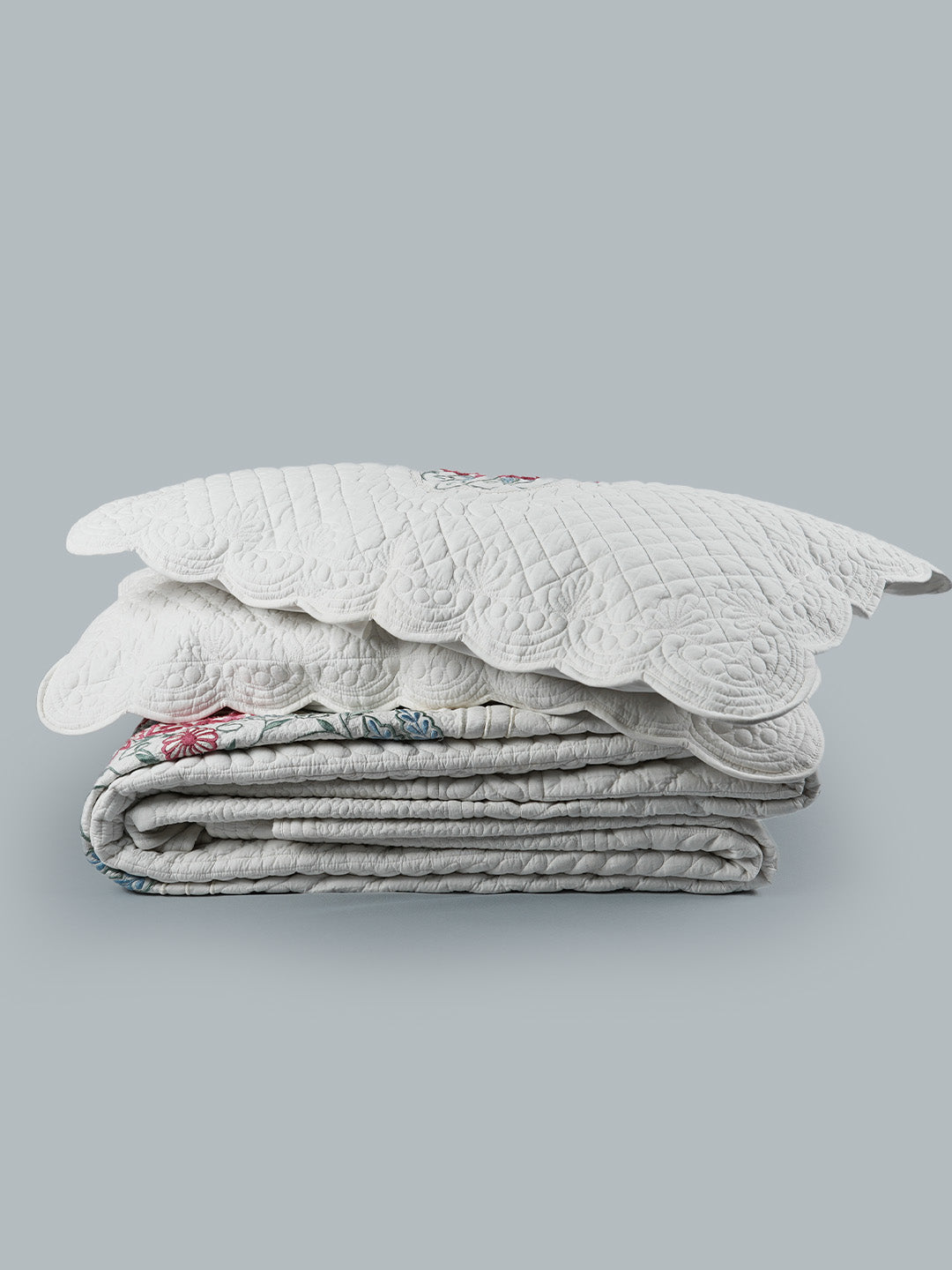 Elevate your bedroom with the Saphora Embroidered Bed Spread, a king-size piece crafted from 100% 30's cotton for exceptional softness and luxury. This exquisite bed spread features an intricate Italian quilting technique with sophisticated borders and scalloped edges, while the hand-quilted center showcases beautiful embroidery work. Filled with 200 GSM hypoallergenic filling, it offers a plush, puffy finish that adds dimension and elegance to any bedroom setting.