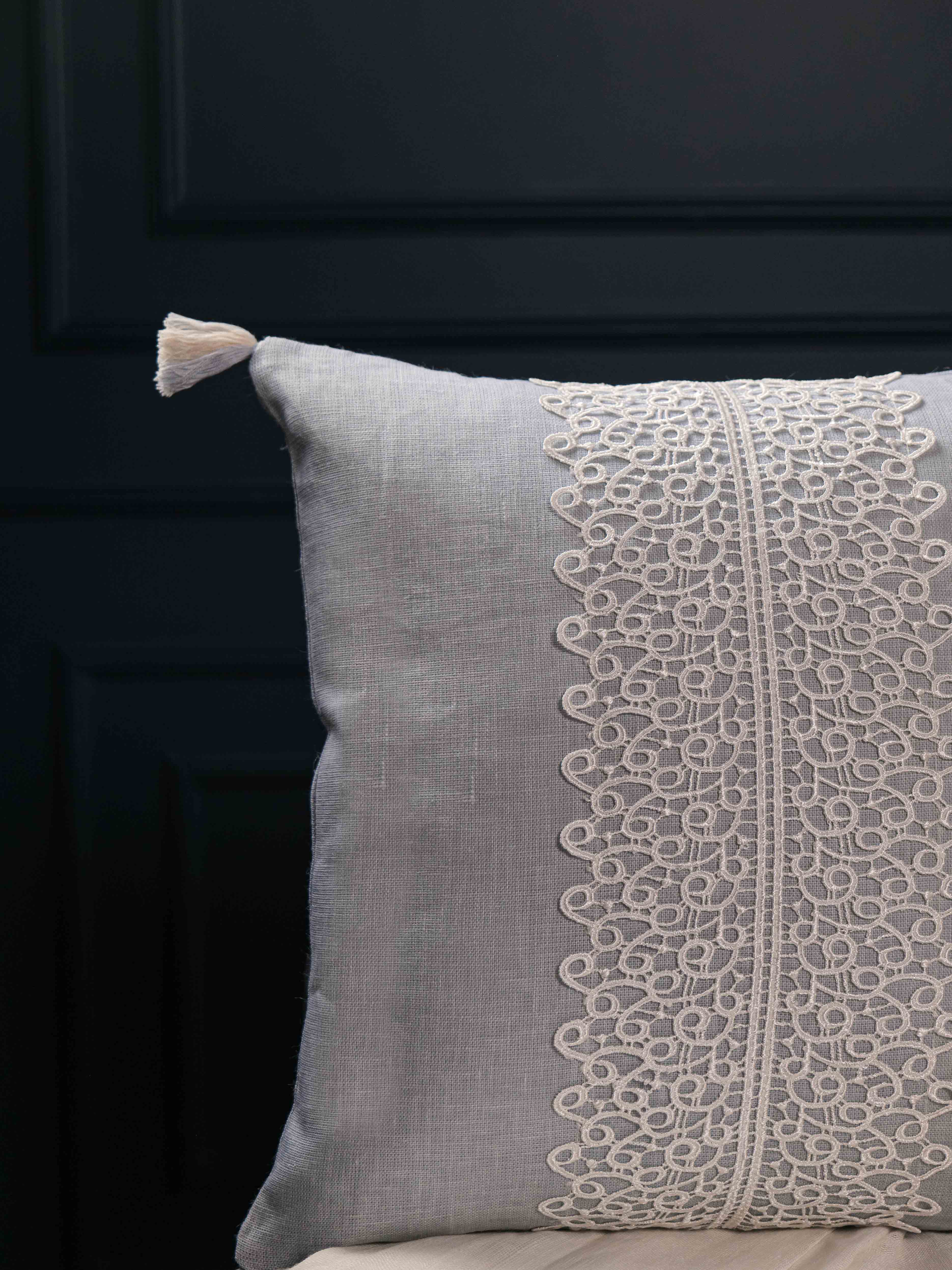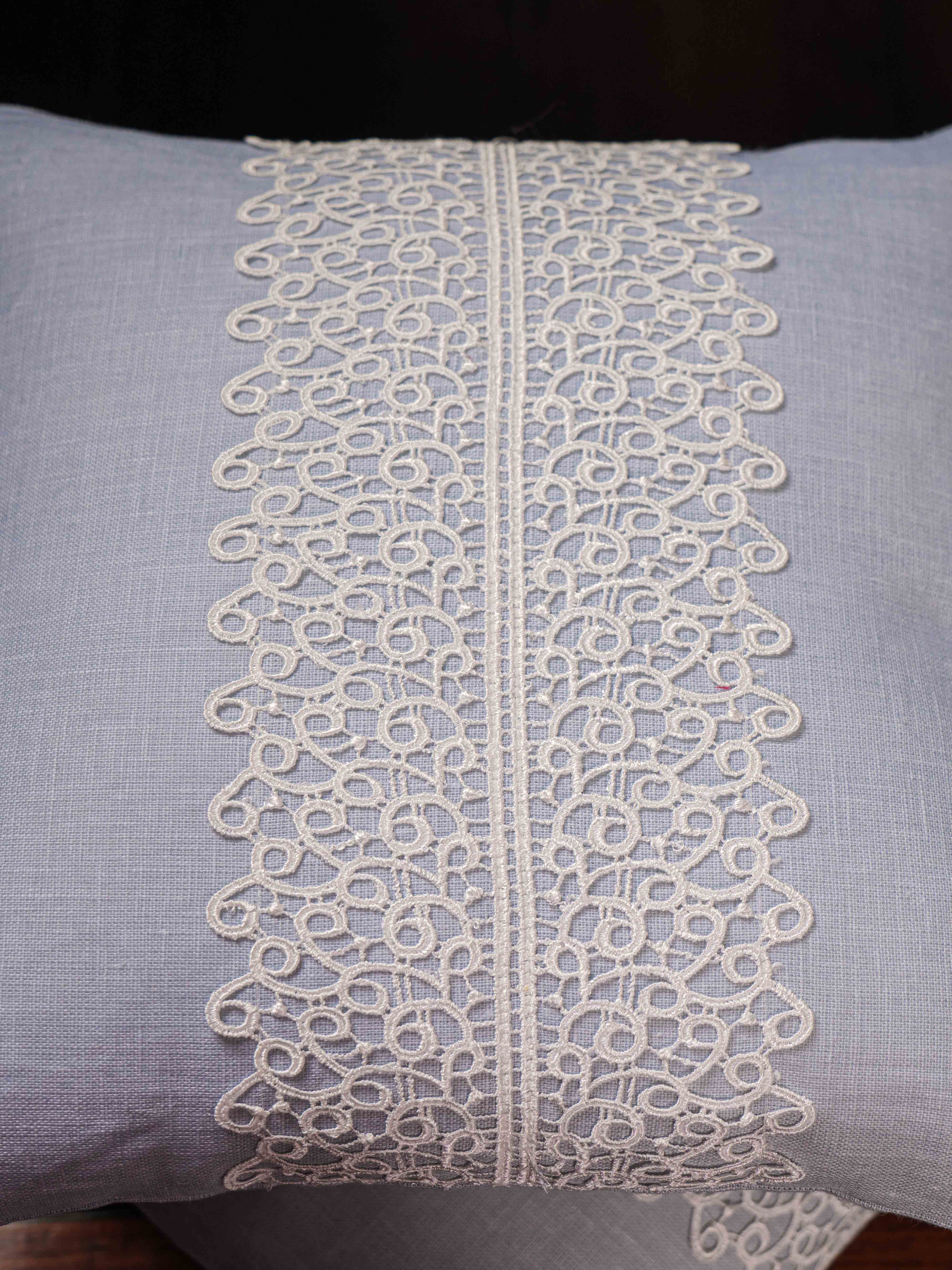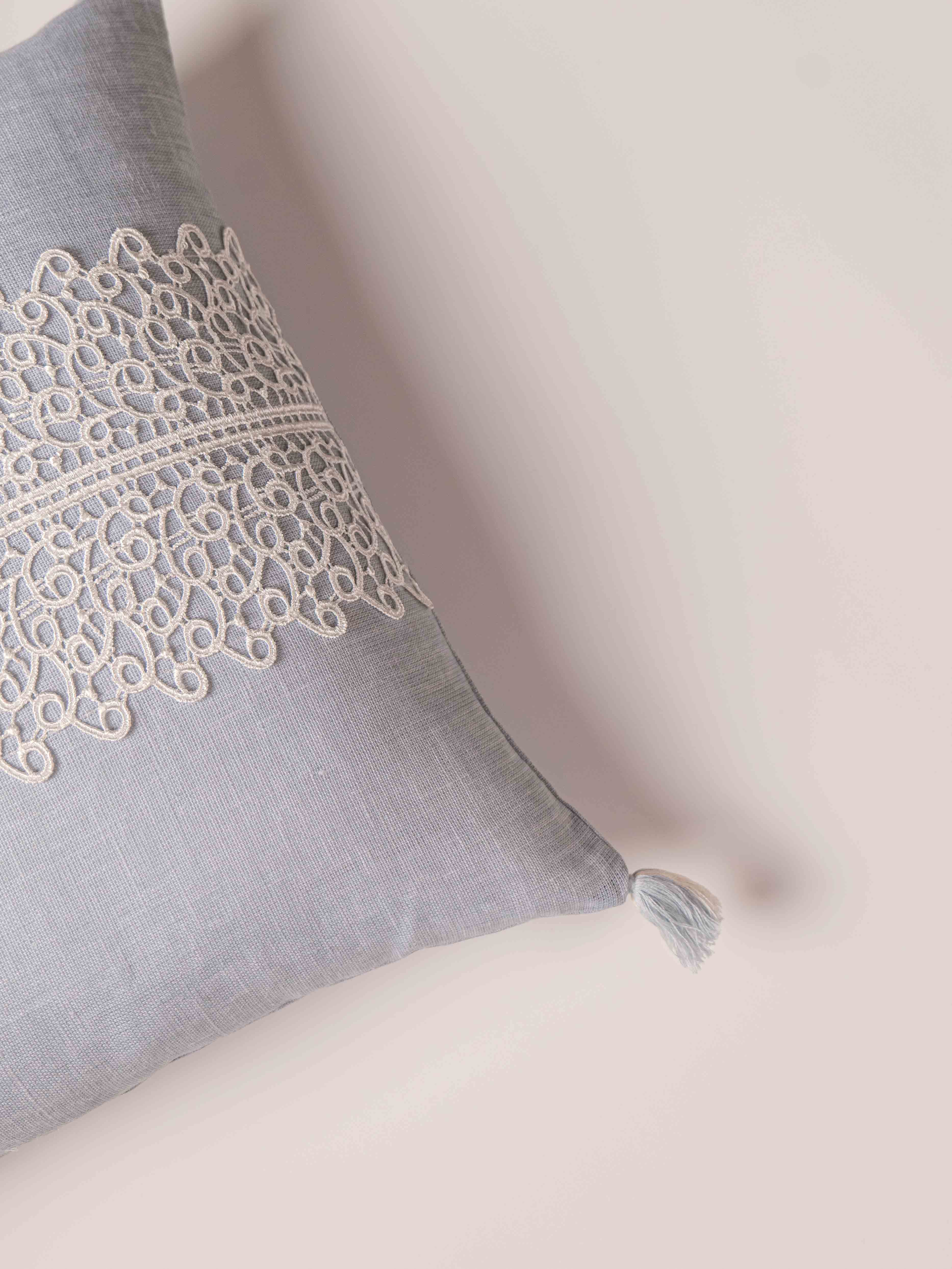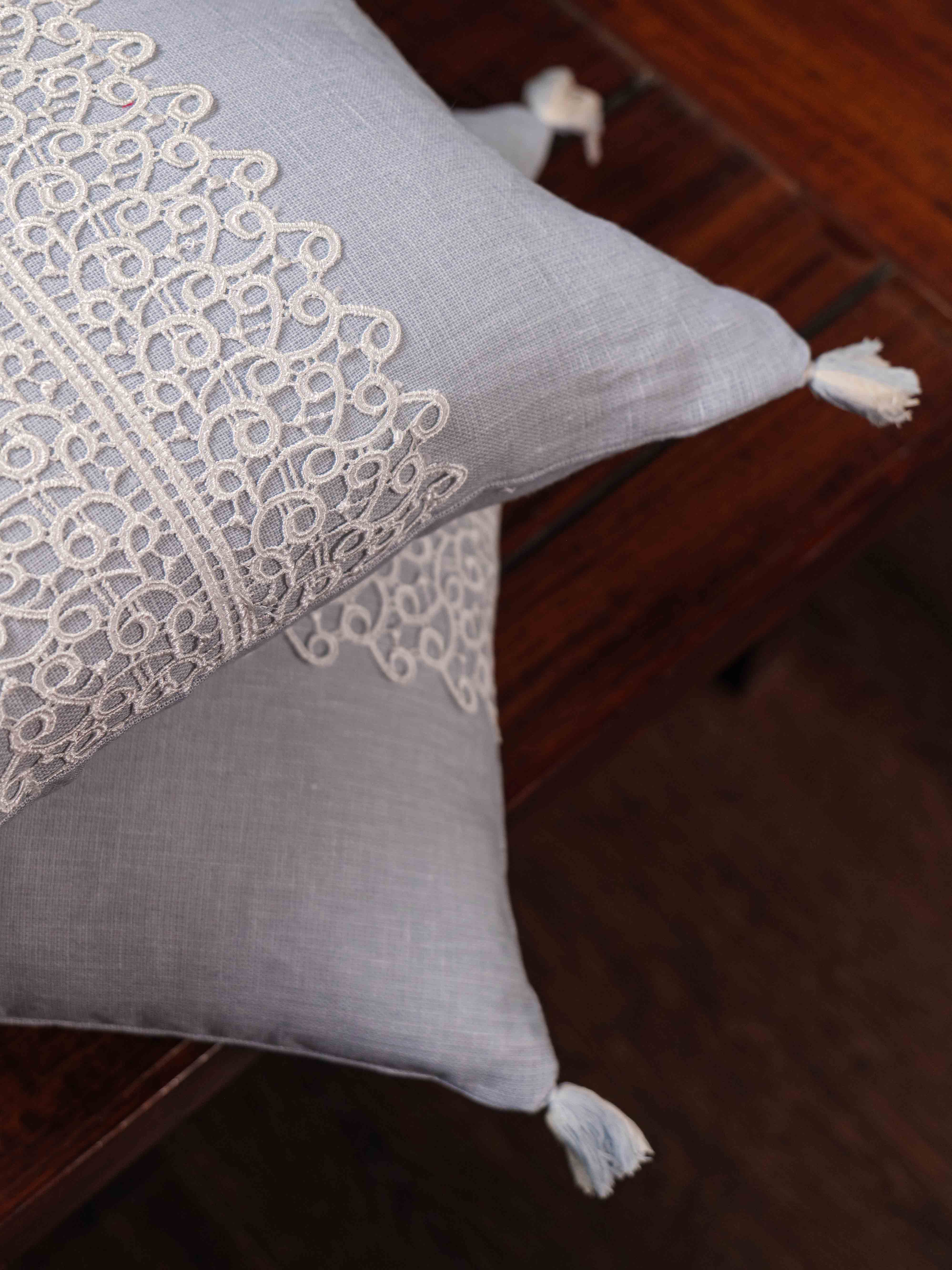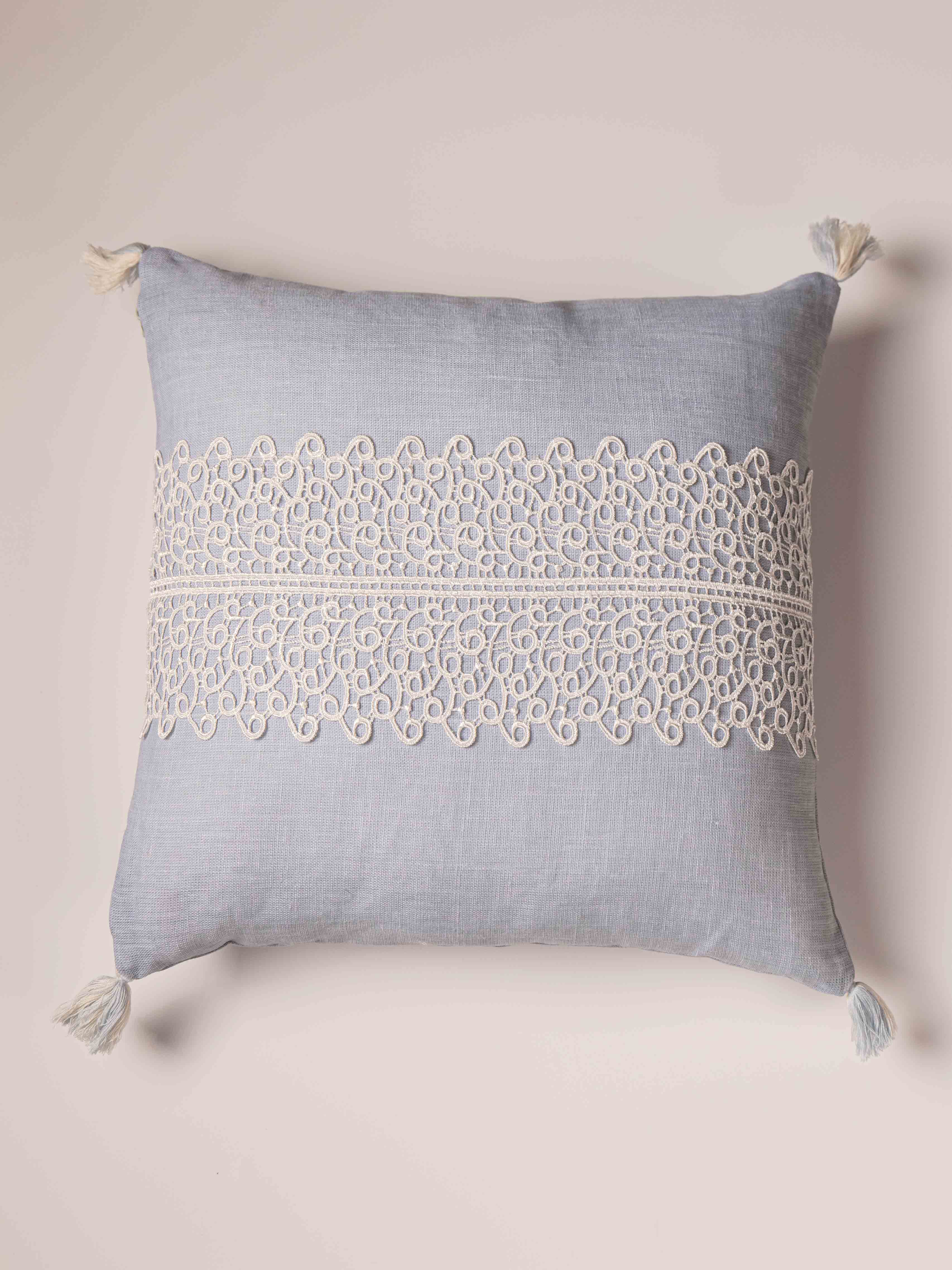 Style this blue lace cushion cover with neutral furniture for a pop of subtle color, or pair with complementary blues for a monochromatic, layered effect. Its delicate detailing and quality construction make it a sophisticated addition to any home. Elevate your décor with this elegant cushion cover, blending traditional craftsmanship with contemporary style.