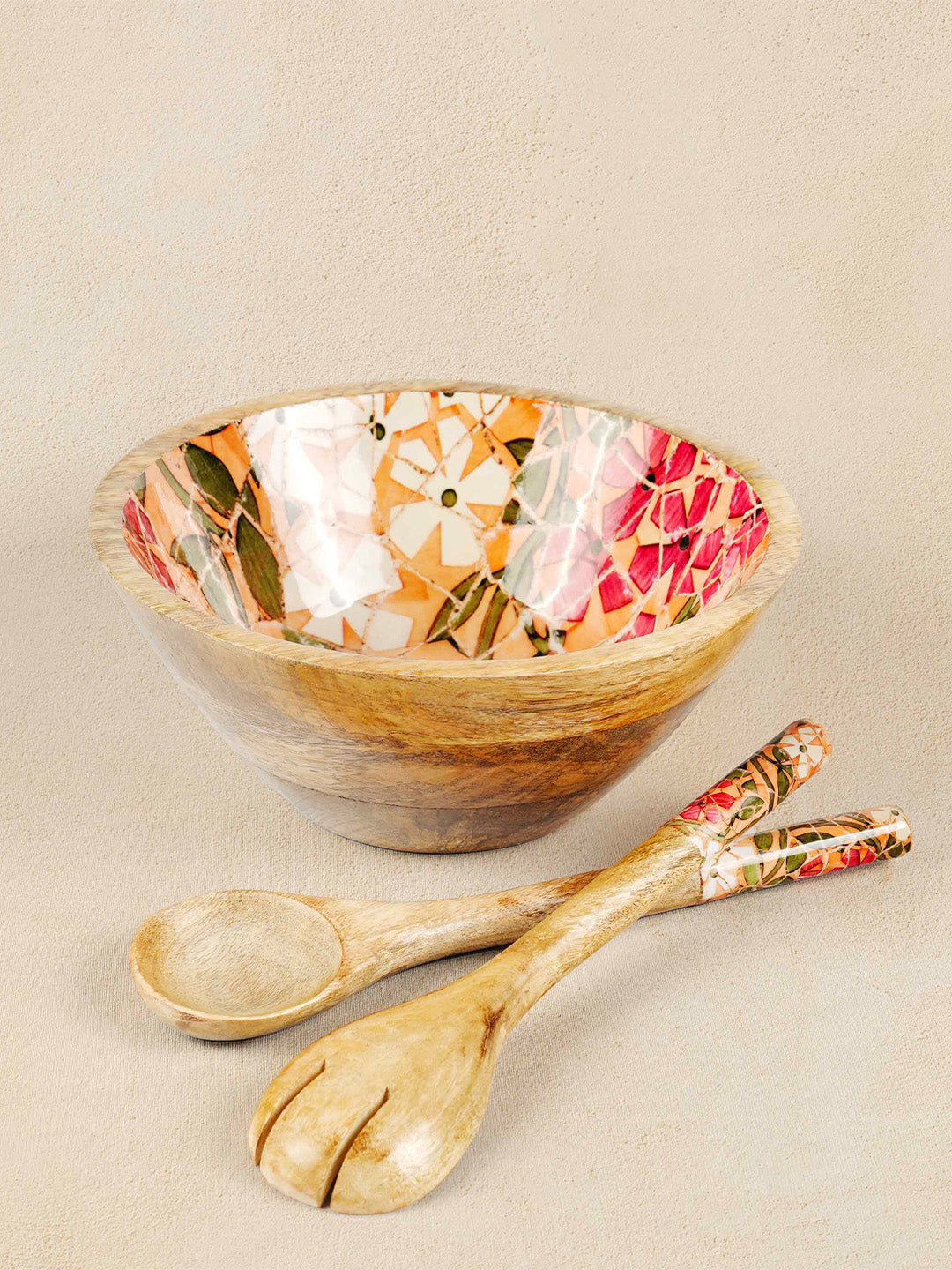 Elevate your dining experience with the Mozac Salad Bowl, an artisanal 10\"x10\"x4\" piece handcrafted from premium mango wood and enhanced with a glossy epoxy resin finish. This stunning bowl features a beautiful mosaic-style floral design that transforms everyday salads into special culinary presentations. The set includes a matching wooden spoon and fork, creating a complete serving solution that combines functionality with artistic beauty.