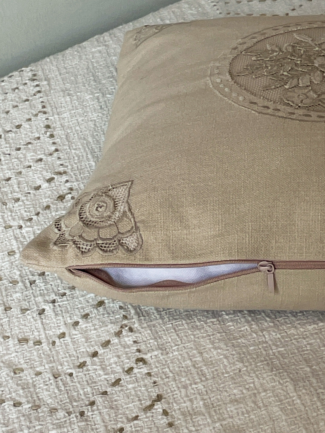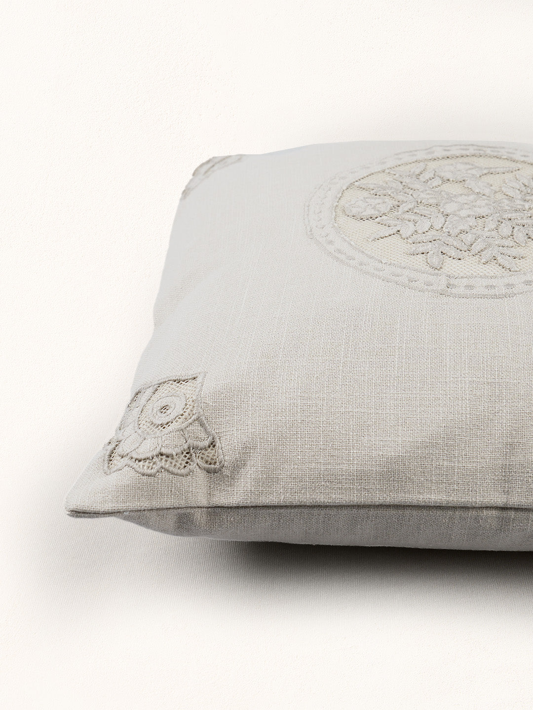 Add a touch of elegance and artistry to your space with AMORADA's Old Charm Cut Work Cushion Cover in a sophisticated Beige hue. Expertly crafted from premium Slub Cotton with a weight of 245 GSM, this cushion cover promises both durability and a soft, textured feel. Measuring 16 x 16 inches, it is the perfect size to enhance your living room, bedroom, or lounge. The highlight of this piece is its intricate cut work motif, showcasing fine craftsmanship that brings a delicate, handcrafted charm to your décor. The neutral beige shade blends effortlessly with a variety of interior styles, from modern minimalism to classic comfort. Designed with a hidden zipper closure for easy insertion and removal, this cushion cover is as practical as it is beautiful. Elevate your home’s ambiance with this timeless piece that celebrates detailed artistry and quality materials. Perfect for gifting or refreshing your home’s look.