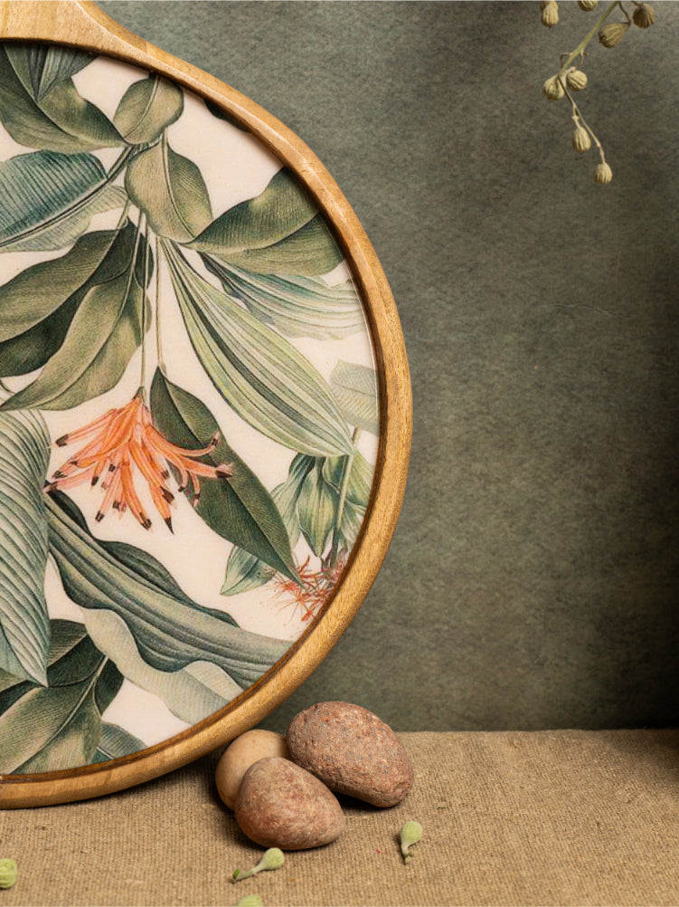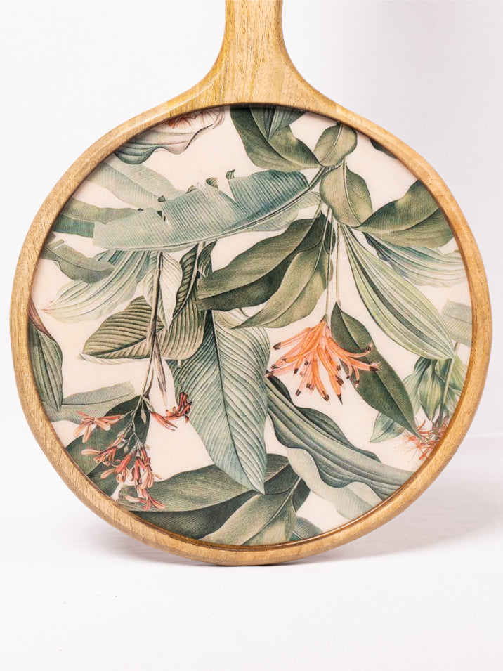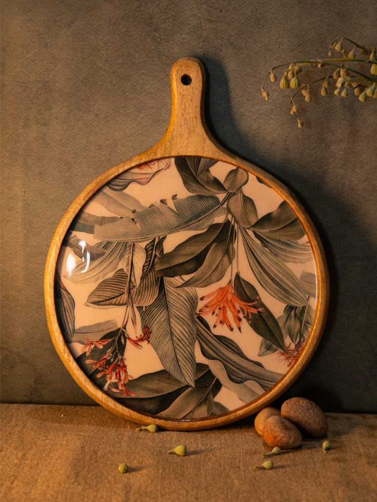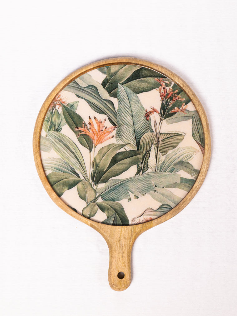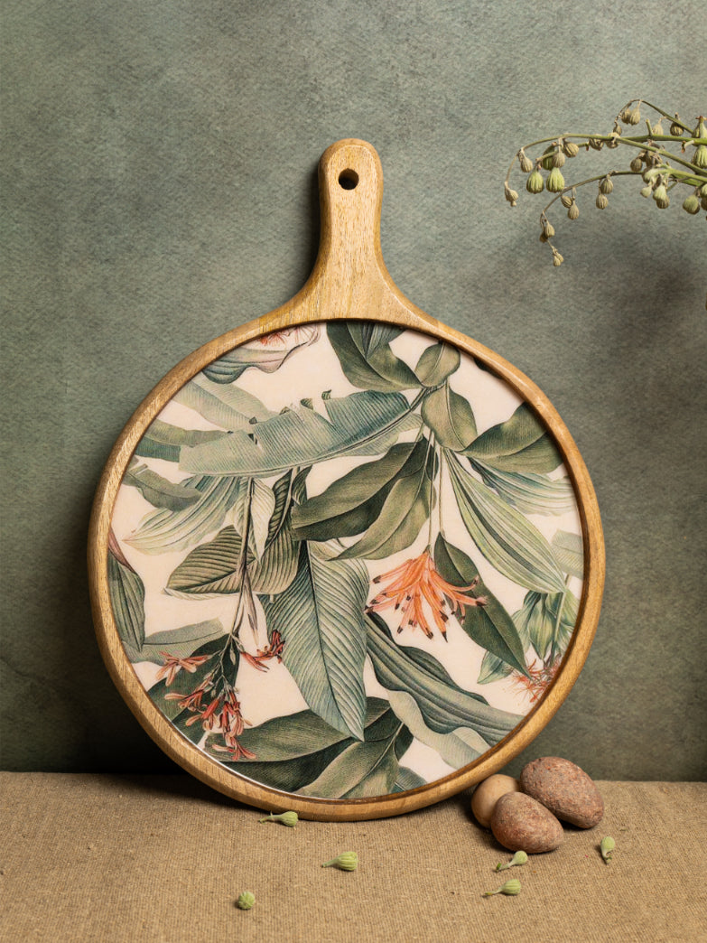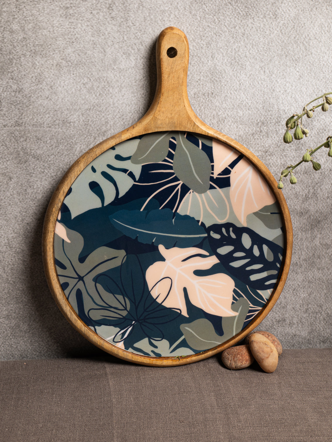 Serve with natural elegance using the Forest Walk Epoxy Platter, a stunning 12-inch serving piece handcrafted from premium mango wood and enhanced with food-safe epoxy resin. This artistic platter features a captivating tropical design in soothing colors, creating a sophisticated backdrop for your culinary presentations. Perfect for serving salads, fruits, or appetizers, this versatile platter combines natural wood beauty with tropical-inspired artistry.