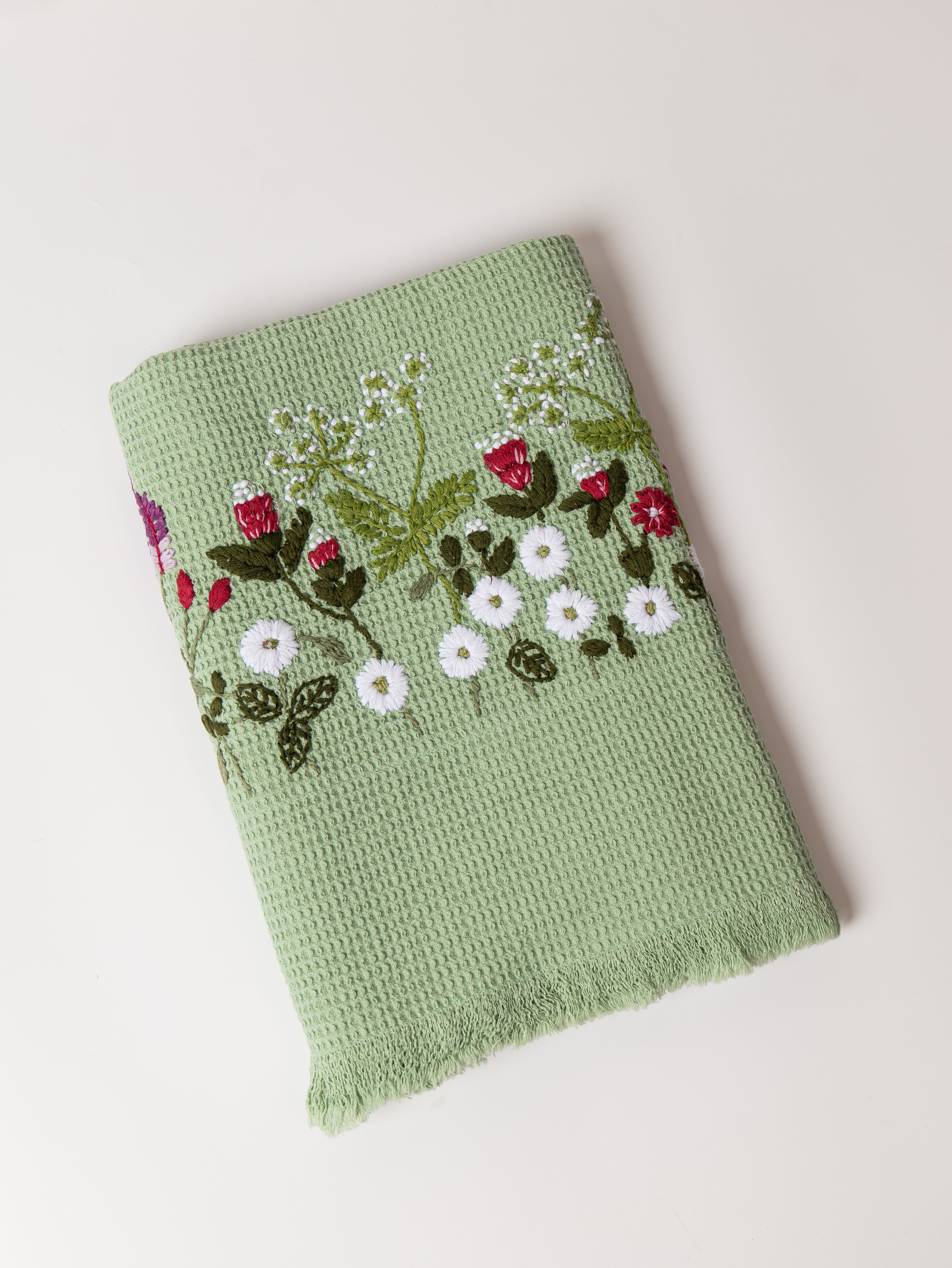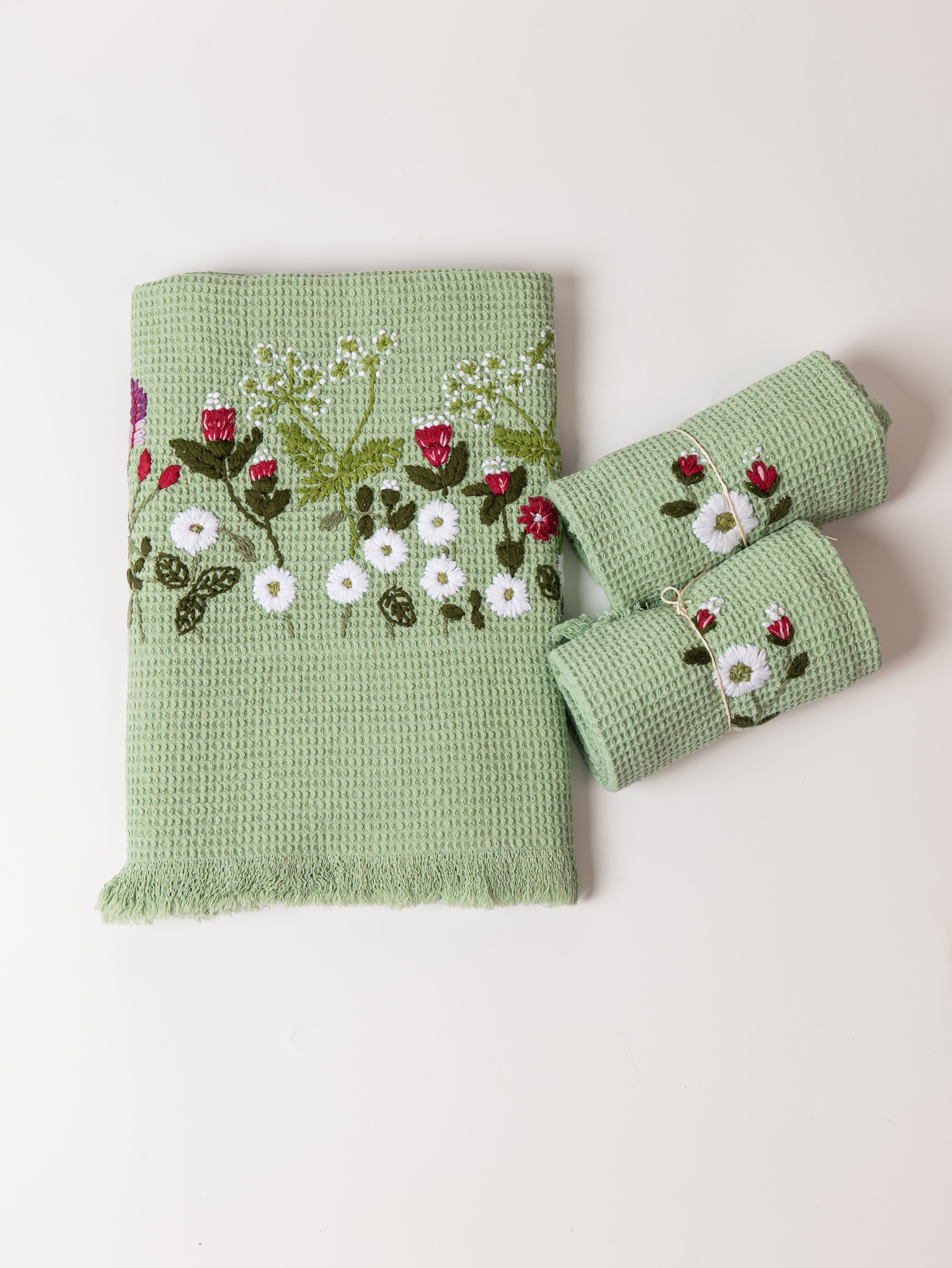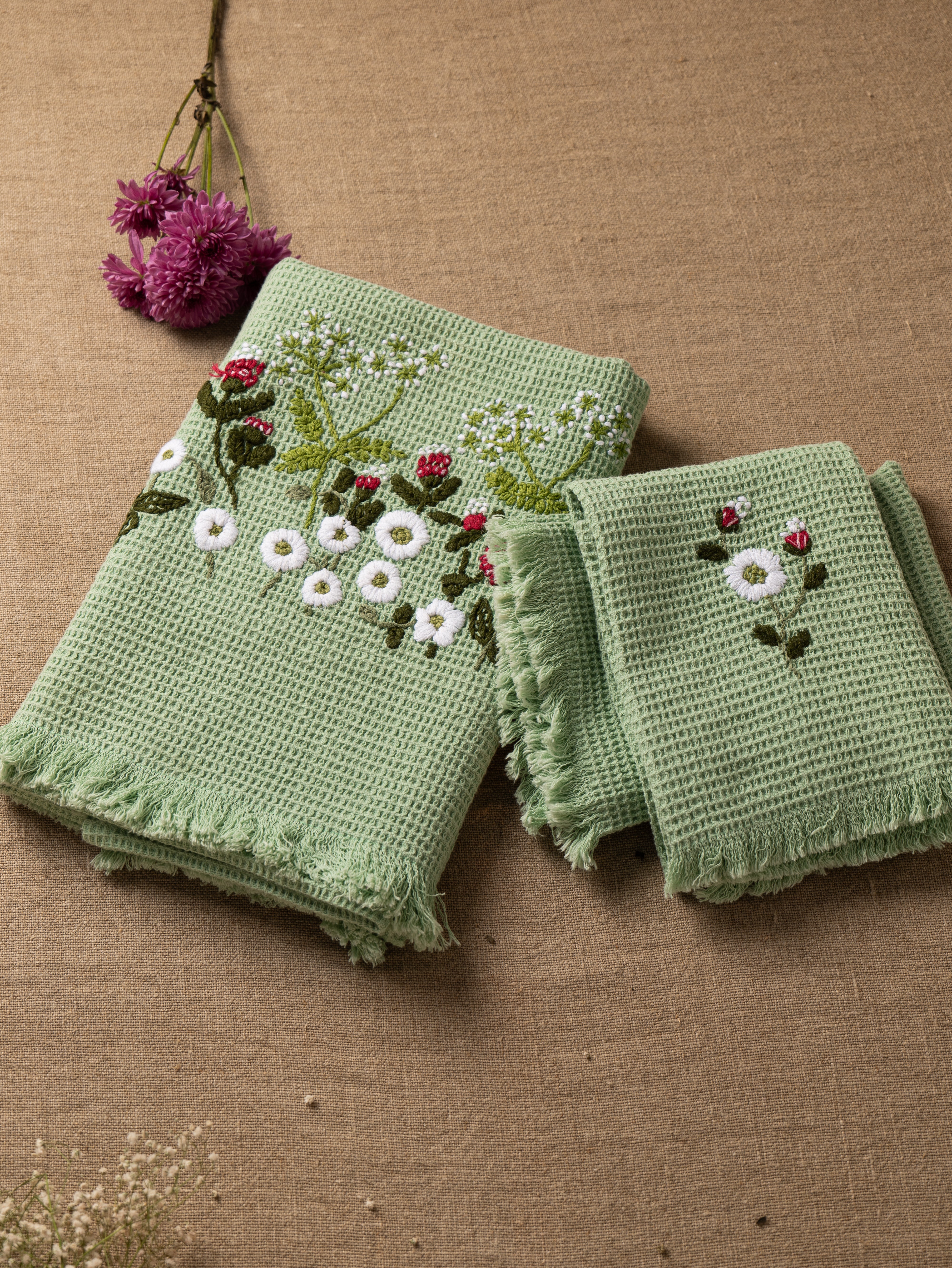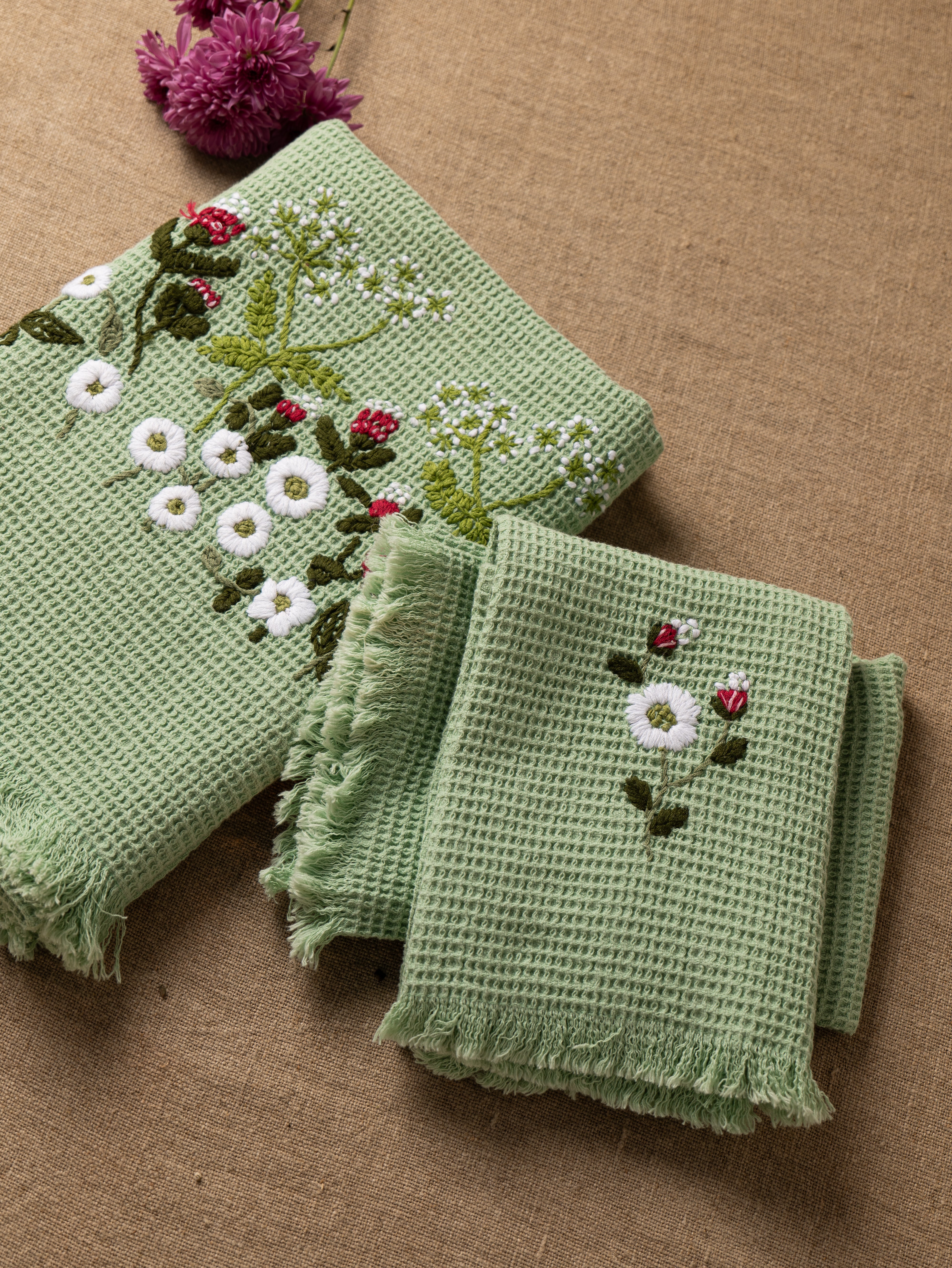 Pair these green towels with wooden or bamboo accessories for an organic, spa-like ambiance, or contrast with neutral bathroom décor for a pop of color. Their gentle texture and beautiful design make them both practical and decorative. Upgrade your daily routine with this embroidered waffle towel set, combining luxury, functionality, and style.