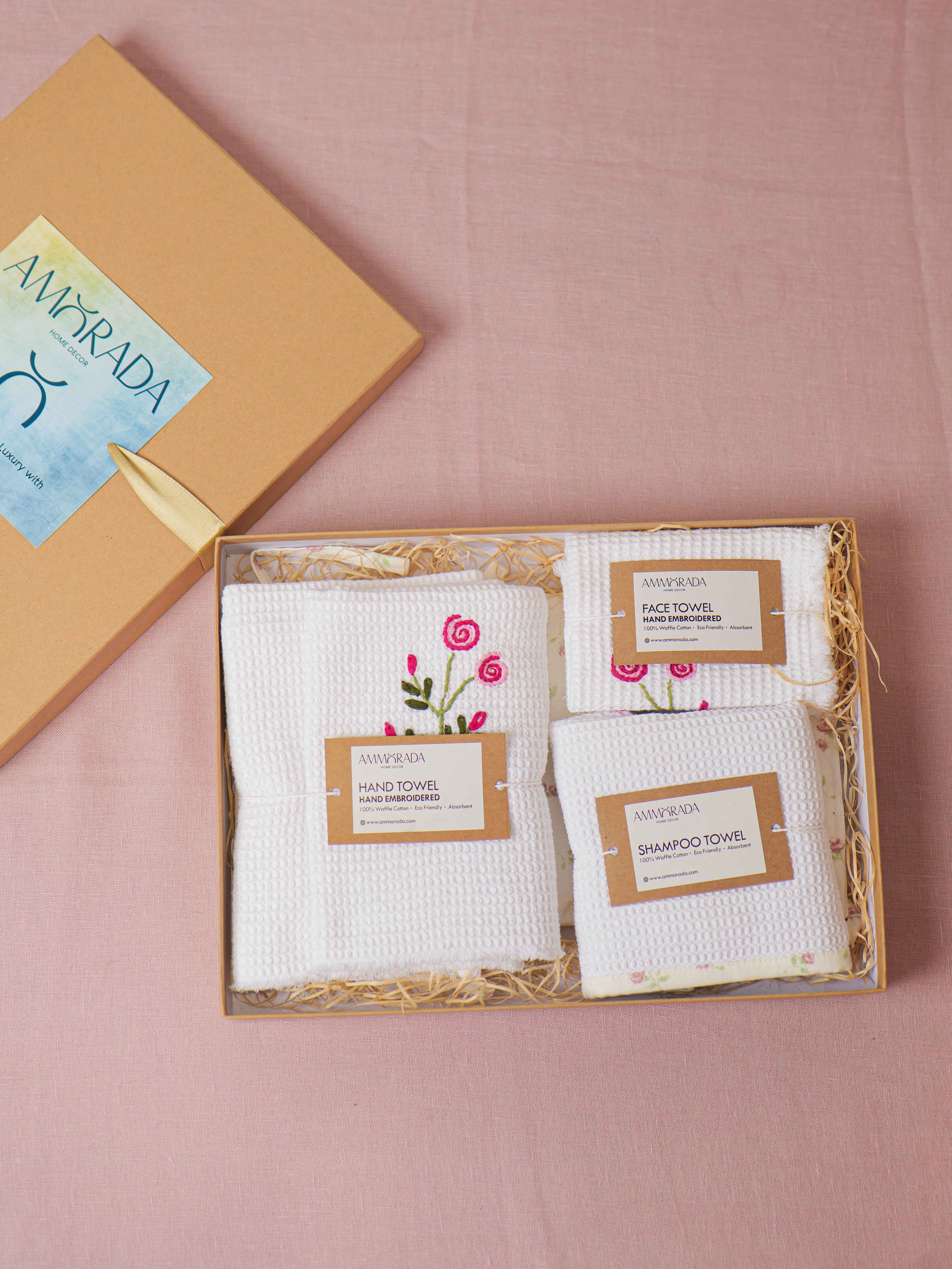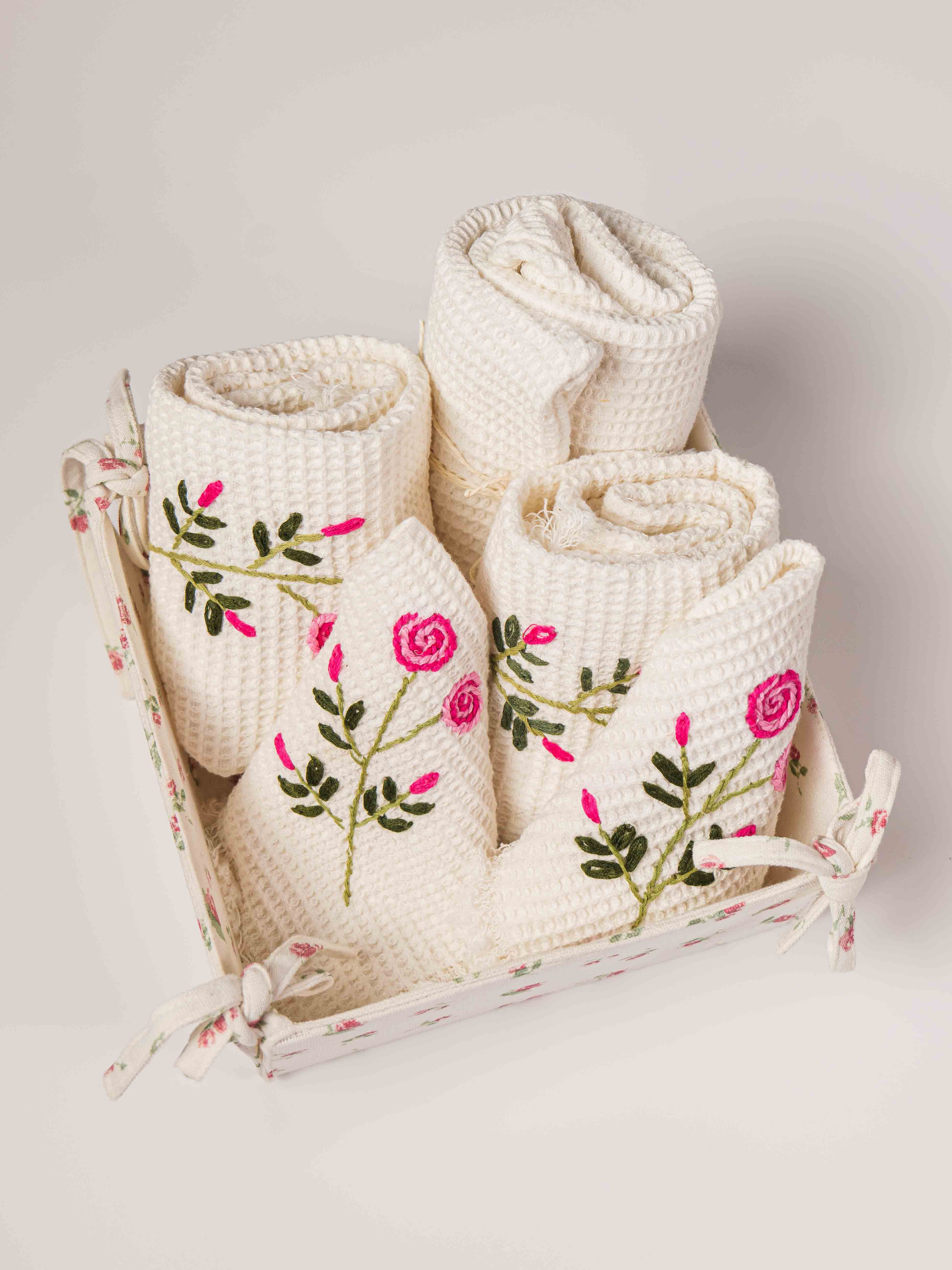 - 2 pcs Hand Towels (65x40 cm each) – crafted from 100% waffle cotton with delicate floral hand embroidery